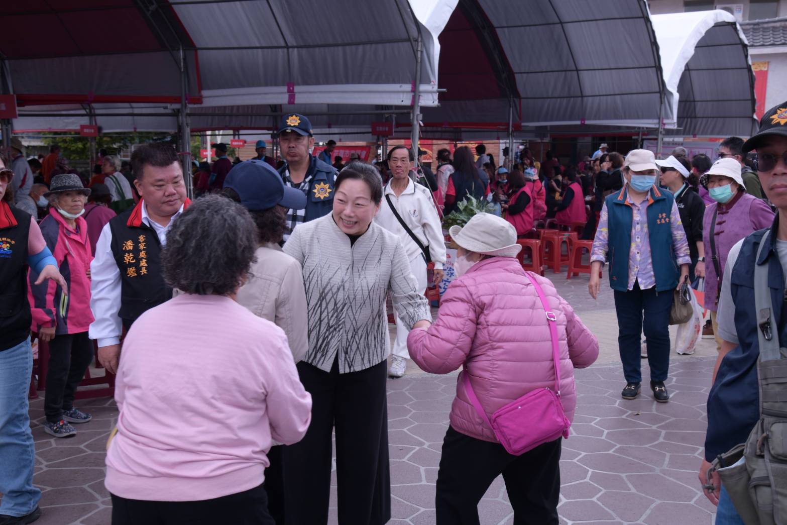 ▲縣長徐榛蔚由客家事務處長潘乾鑑(左)陪同,向鄉親握手親切寒暄。