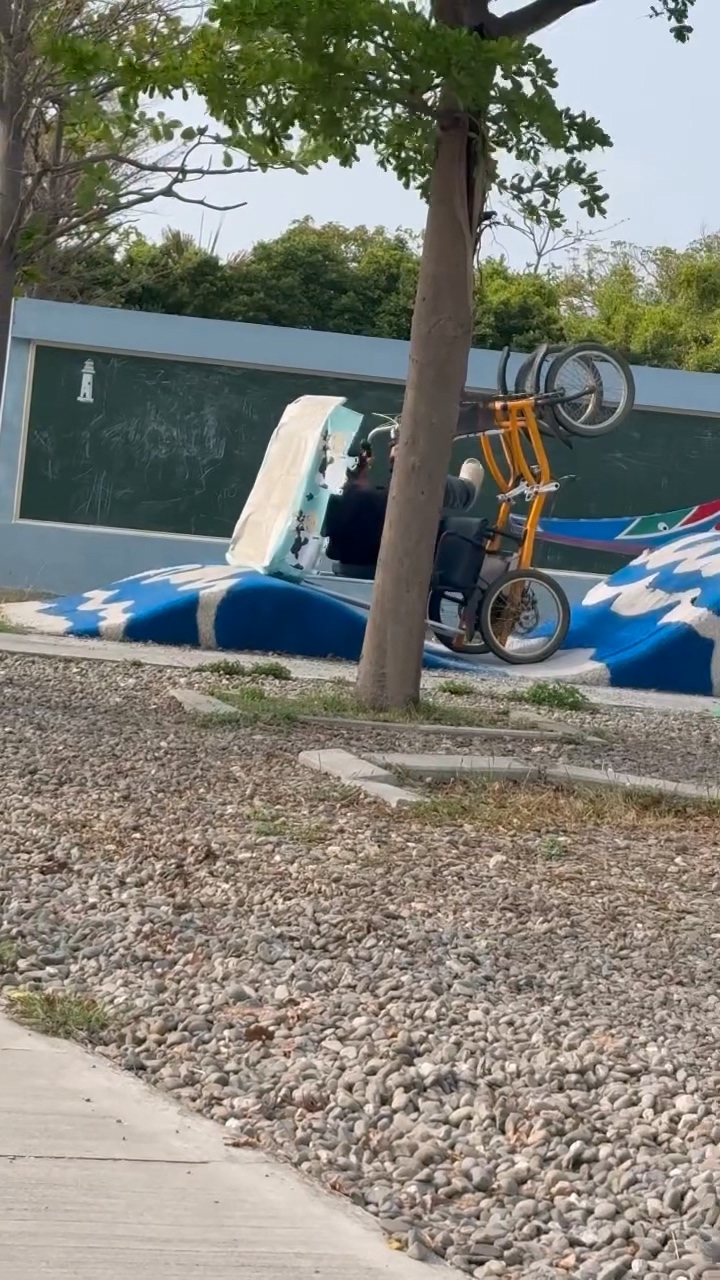 網友在Threads發文指出,在高雄旗津生命紀念館對面的小公園,看到有人將協力車騎上一個藍白彩繪的波浪型裝置,由於該裝置坡度過於陡峭,整台車當場失去平衡翻覆在波浪坡上,男子隨後一臉尷尬地從翻覆的車廂內爬出。