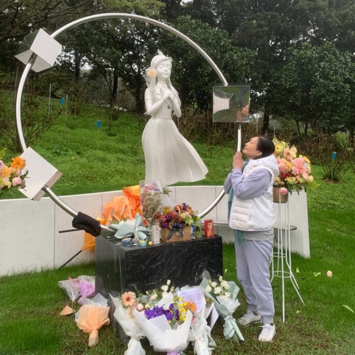 照片中,S媽身穿淺色休閒套裝搭配白色羽絨背心,站在大S雕像前雙手合十、神情專注地仰望著女兒。她在貼文中寫道:「親愛的寶貝:台北天氣不錯,媽媽來金寶山看妳,一上山卻一片淒風苦雨,媽媽心中也苦不堪言!」簡短文字卻滿是母親對女兒深深的思念。
