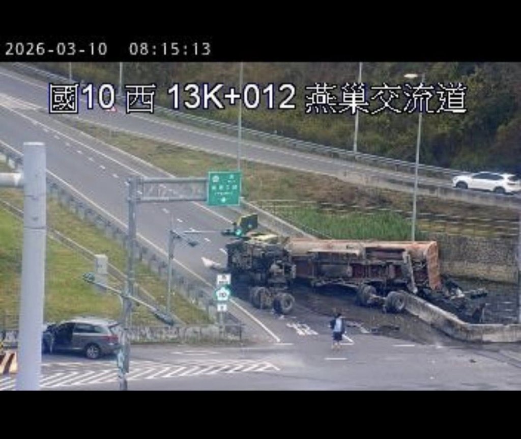 國道10號燕巢交流道砂石車翻覆。翻攝畫面