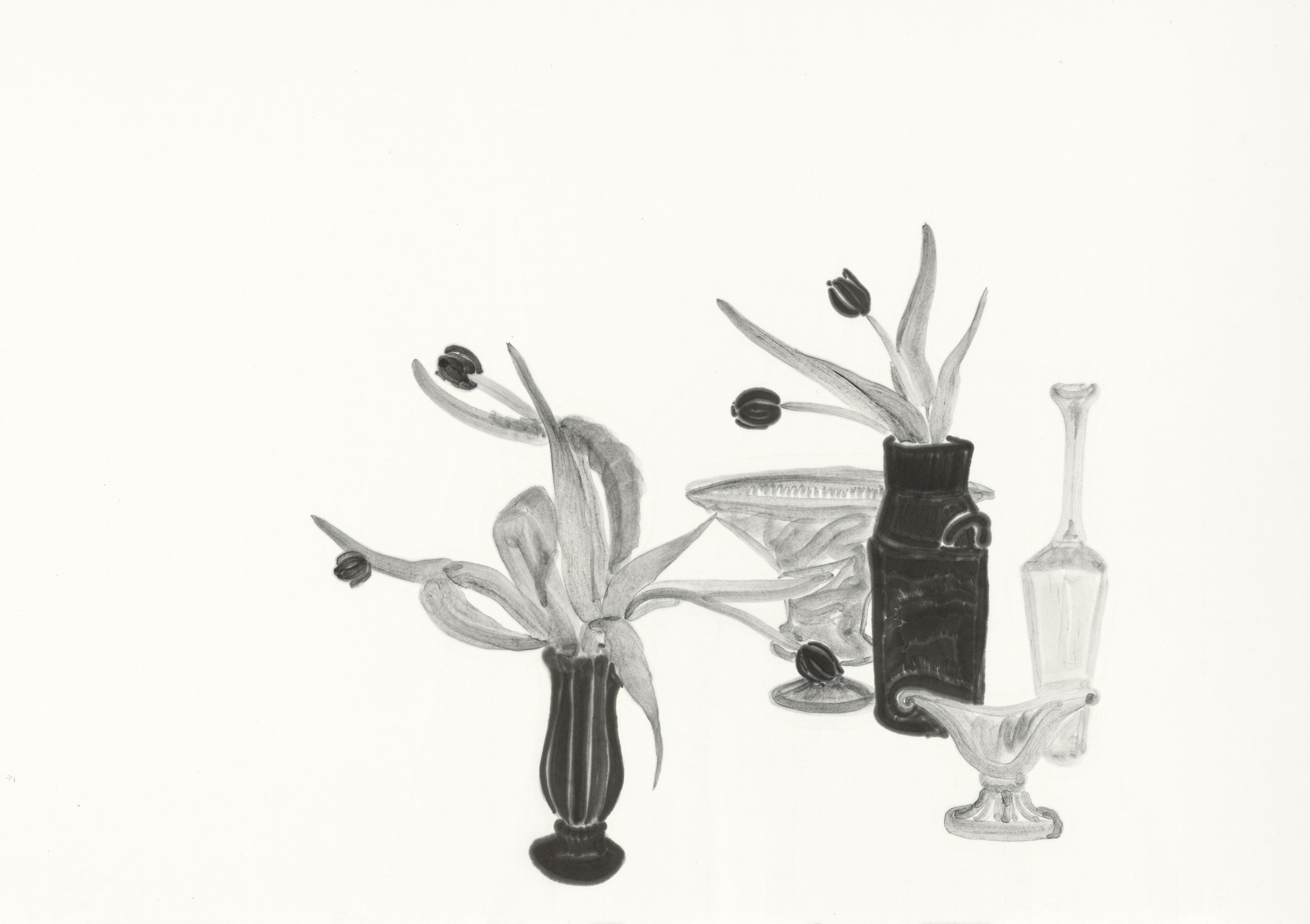 展覽作品引領觀者進入如同「蝴蝶複眼」般的視角,捕捉隱藏在植物背後的細節。例如在作品〈一雙貝母〉中,墨色花蕊水潤飽滿,像是墨水在紙張濕潤時落筆後,留下的時間痕跡;〈向光斜倚的鬱金〉則捕捉了葉片向陽光傾斜、充滿生命韌性的姿態。