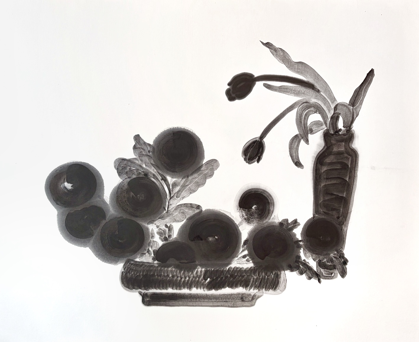 此外,作品〈貓與一室植物〉描繪了貓咪閒適地看著植物,植物邊緣帶著如水漬般蔓延的模糊光暈,將生活中的動靜瞬間凝固成一幅靜謐的畫面。展場中更巧妙運用空花器與大面積留白,讓空間不再擁擠,而是成為觀者可以靜下心來思考、停留的驛站。