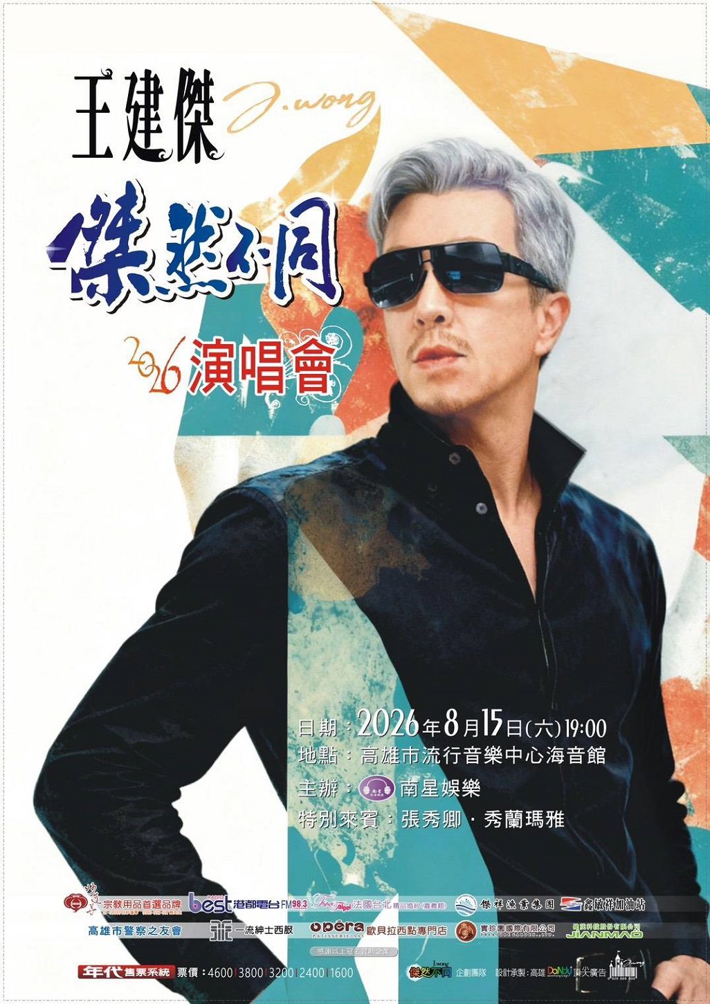 《王建傑2026傑然不同演唱會》將於8月15日晚間7時在高雄流行音樂中心海音館登場,票價分為4600、3800、3200、2400及1600元。主辦單位表示,這不僅是一場演唱會,更是一段陪伴歌迷回顧台語經典情歌歲月的音樂旅程,邀請樂迷走進現場,一起用歌聲與回憶寫下難忘的夏日篇章。