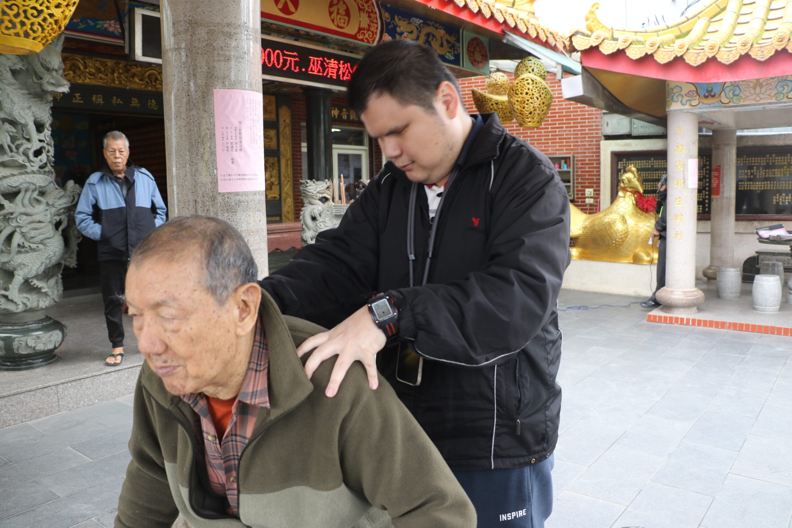 ▲先天視障者呂坤諭幫福久宮的董事長李次雄按摩 力道拿捏令人滿意。(圖/新北市社會局 提供)
