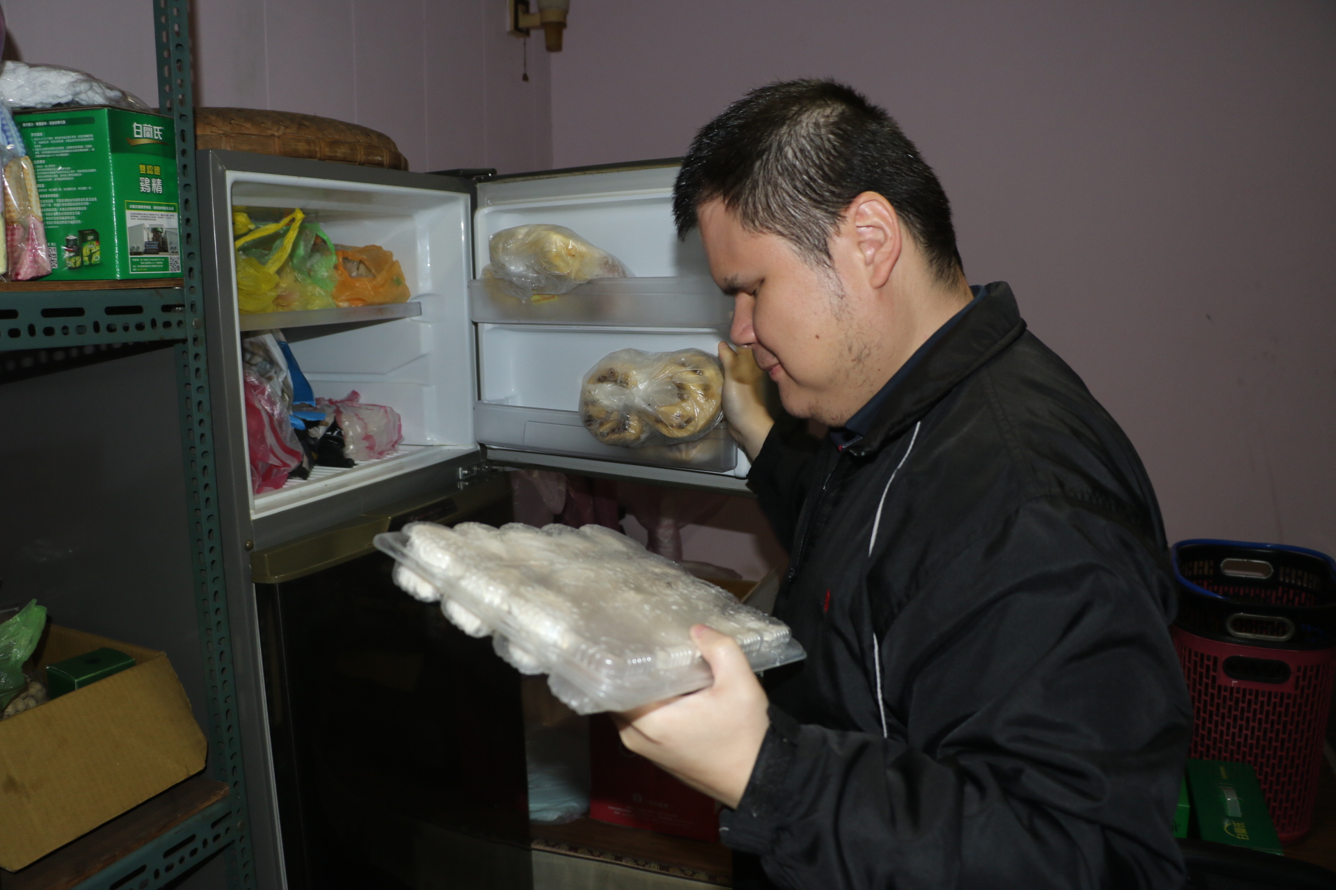 ▲先天視障者呂坤諭在樂明中心生活自理老師訓練下 熟練地從冰箱取出冷凍水餃 準備用電鍋烹煮。(圖/新北市社會局 提供)