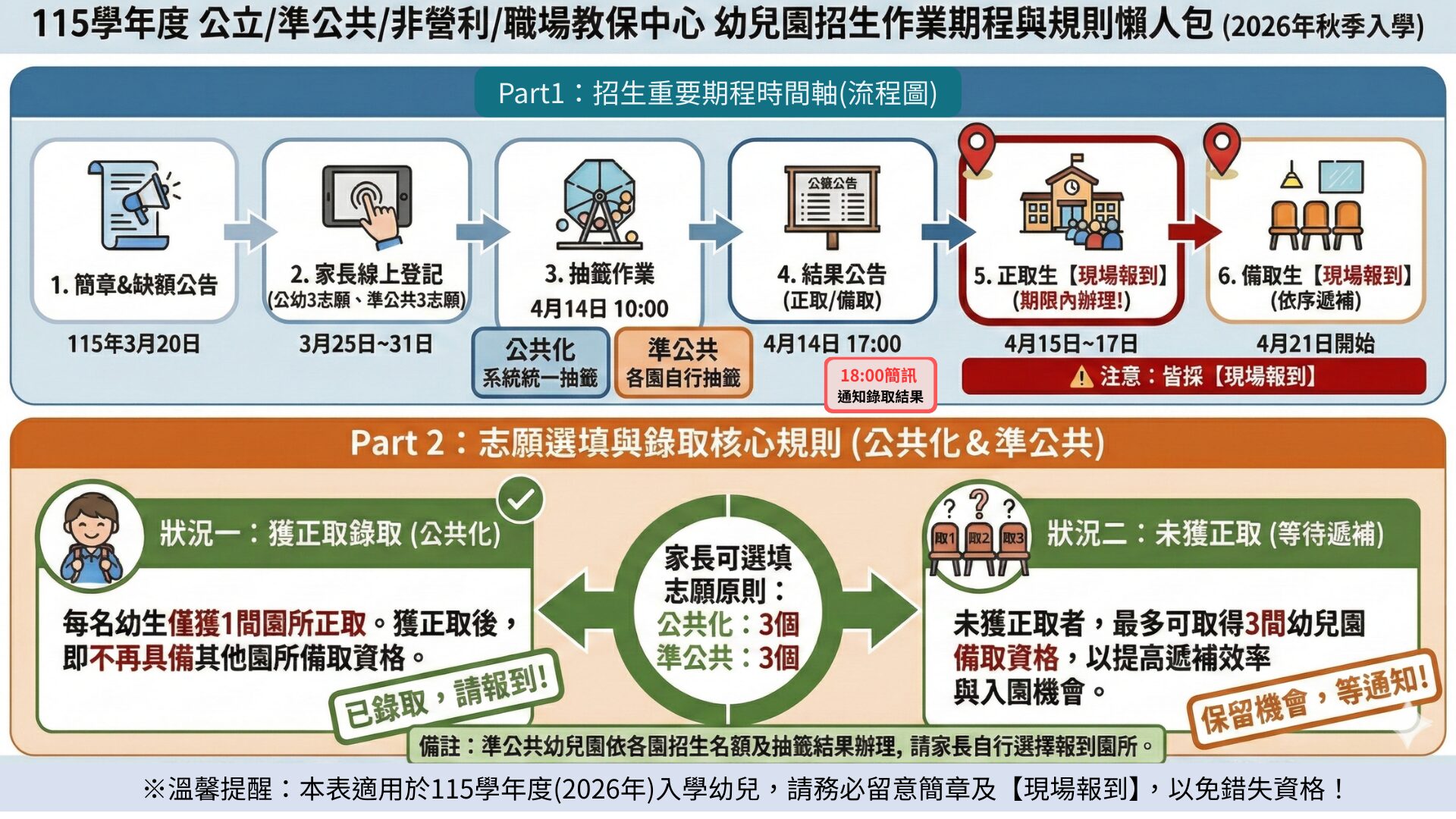 今年招生制度亦同步調整家長志願選填間數,由原公共化幼兒園10間、準公共幼兒園5間,改為公共化幼兒園及準公共幼兒園各3間,使家長更聚焦於實際就讀意願,減少重複錄取與反覆遞補情形,加快報到與分發流程,提升整體招生效率與穩定度。