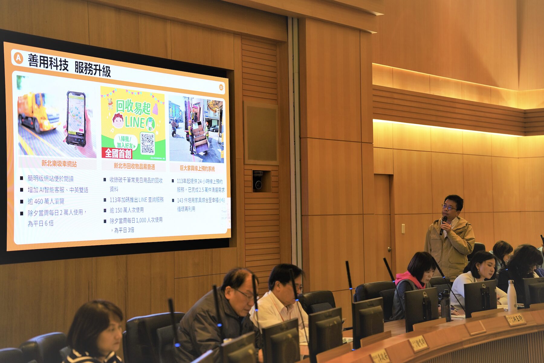環保局長程大維在報告中指出,為提升環境品質,新北市全面推動「CLEAN」五大行動 ,從市容整潔深化至淨零轉型,並締造多項全國首創的施政亮點,包括C乾淨城市(Clean City),打造看得見的乾淨,建立道路髒污通報單一窗口,通報改善率達100%,並首創推動公廁「乾式清潔作業指引」與「性別友善廁所標章」。此外,新北市是全國唯一連續4年獲環境部「金環獎」肯定之縣市,對於環境污染取締毫不懈怠,並於行政院「向海致敬」考評連續4年蟬聯特優。