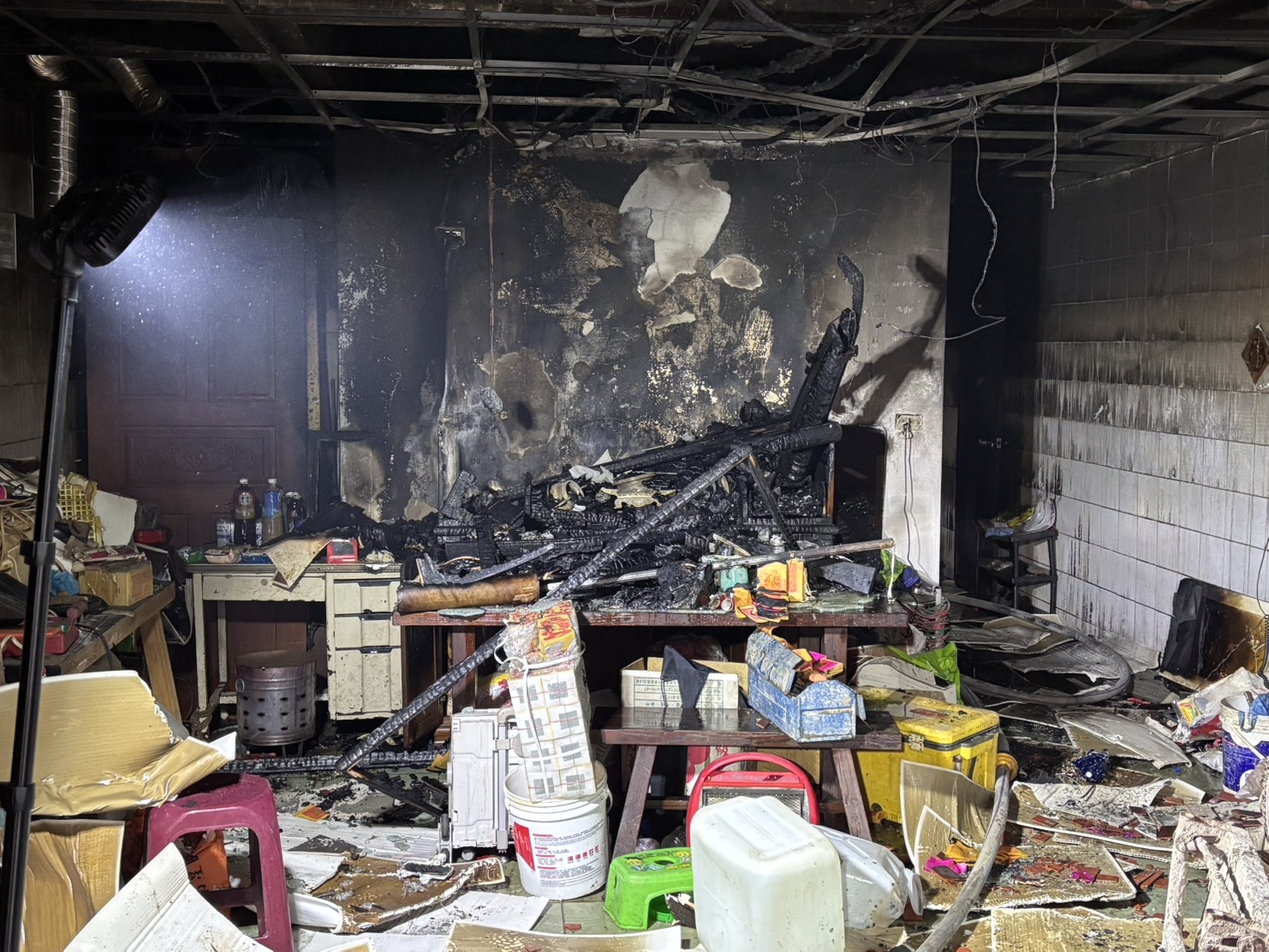 消防隊員勘驗驗火場初步研判為1樓神明廳起火,燃燒面積2平方公尺,起火原因待進一步調查。