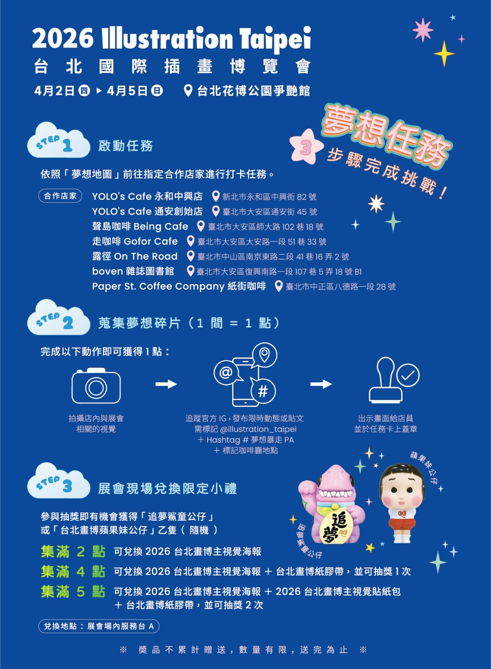 完成任務的參與者亦可參加現場抽獎活動,有機會獲得多項驚喜小禮,其中更包括展會人氣周邊「 追夢鯊童公仔 」、「 台北畫博蘋果妹公仔 」…等。透過城市咖啡廳的串聯,不僅讓插畫文化走入日常生活場景,也讓觀眾在城市漫遊的過程中,逐步累積屬於自己的夢想旅程。