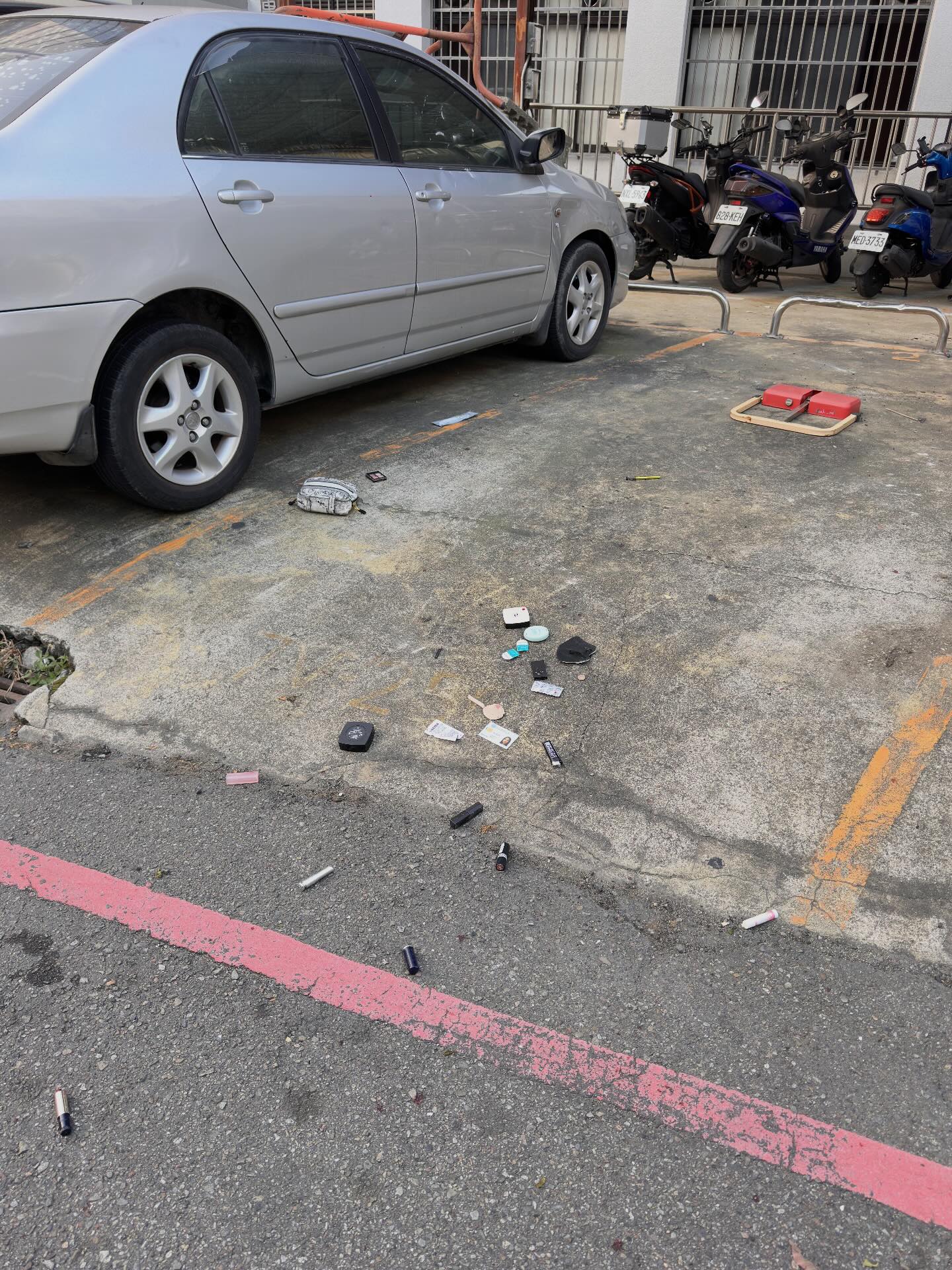 女子身上物品散落砸車現場。翻攝畫面