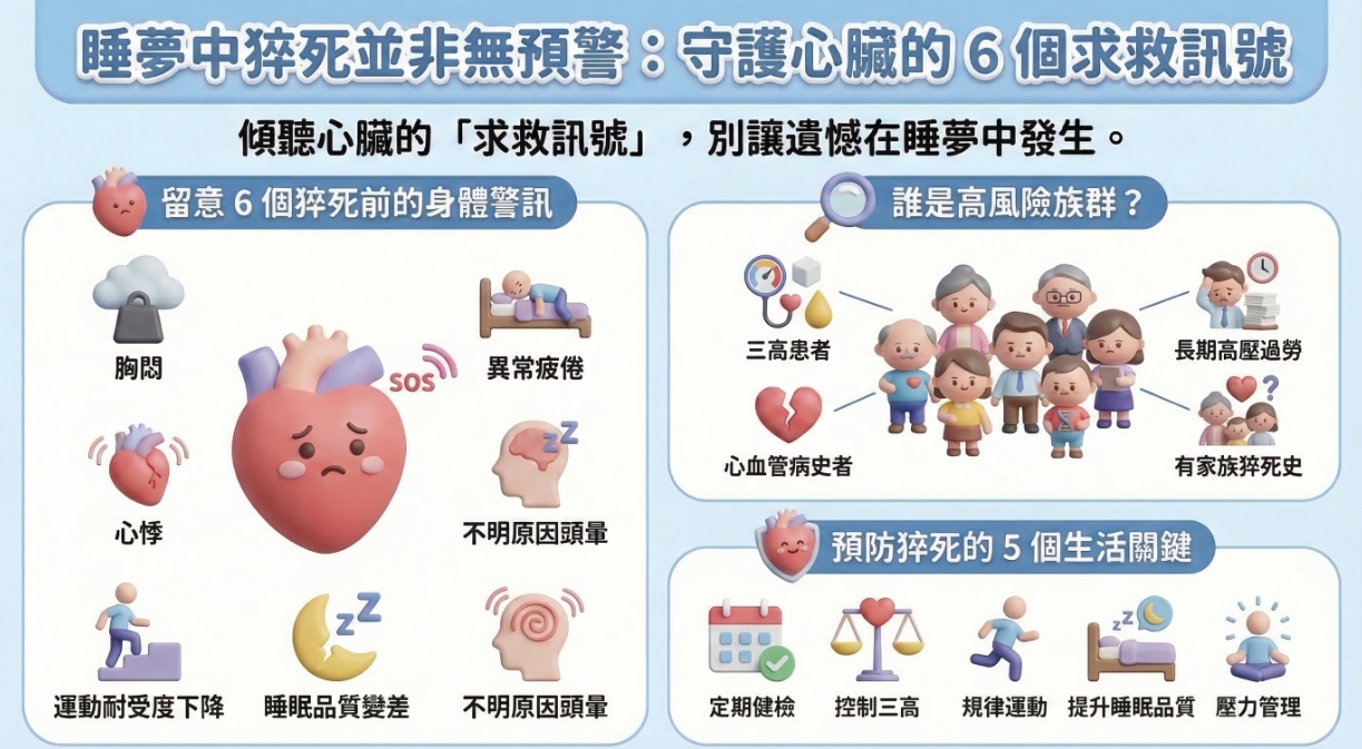 回覆:不一定。很多猝死看起來像是突然發生,但身體往往早就出現一些小提醒,例如胸悶、心悸、容易疲倦、運動時特別喘,或睡眠品質明顯變差。麻煩的地方就在這裡,這些訊號很容易被當成壓力大、太累、沒睡飽。如果你最近反覆出現這些狀況,別只靠硬撐,安排一次健康檢查會比較安心。