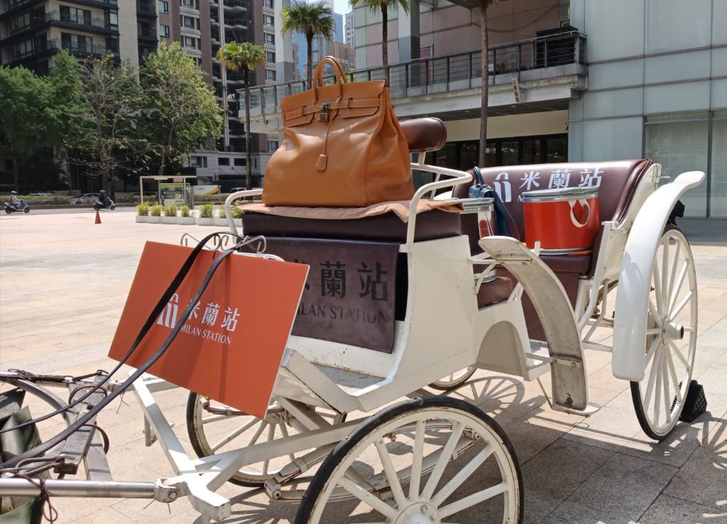 ▲「米蘭站」台中七期老虎城旗艦門市開幕特別打造白馬與馬車造景裝置,搭配限量巨型柏金包與凱莉包展示,營造濃厚精品氛圍。