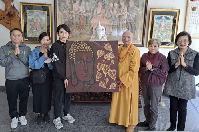 ▲自閉症畫家魏廷亘專程到三峽普賢寺贈送宗道法師「佛陀與菩提」畫作,以感謝師父的栽培。(圖/新北市社會局 提供)