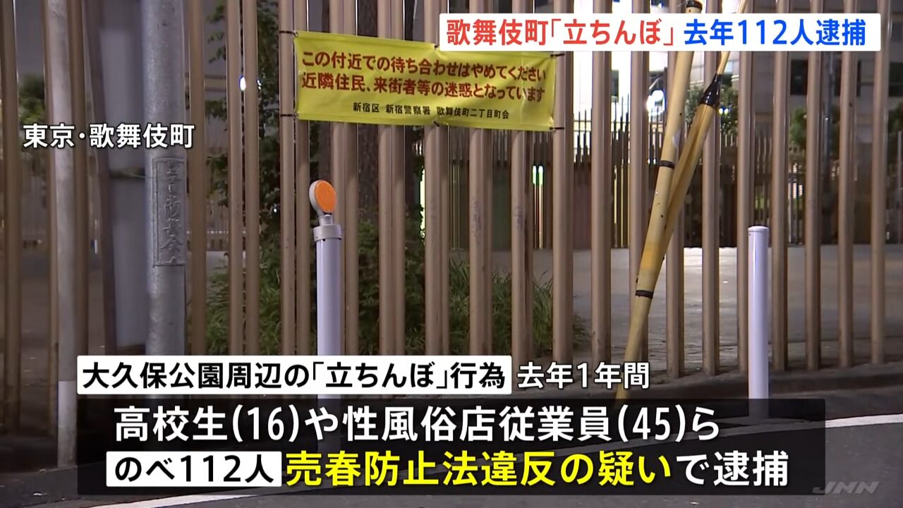根據日媒報導,警方表示在新宿歌舞伎町大久保公園周邊查緝流鶯行為,以違反賣春防治法為由,逮捕了16歲女高中生以及45歲性風俗店員工在內的共112人。