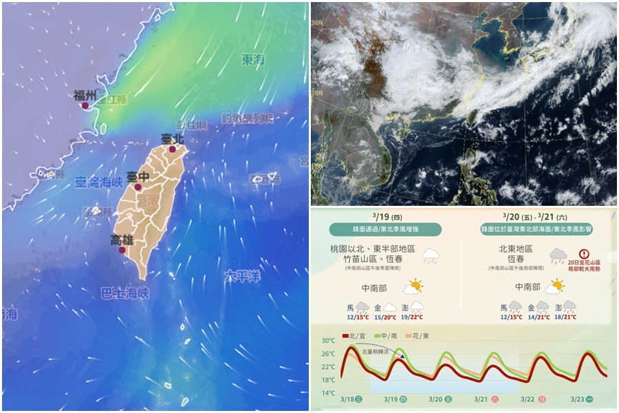 今天3月19日鋒面通過及東北季風增強,北部及東北部氣溫稍有下降,其他地區早晚偏涼,臺灣東半部地區、新竹以北、恆春半島、竹苗山區及馬祖、澎湖有局部短暫陣雨,午後中南部山區有零星短暫陣雨,其他地區及金門為多雲到晴。
