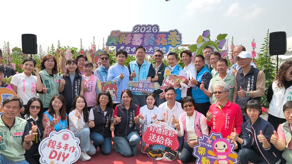 員林市公所於今(19)日在員林南區公園的蜀葵花田,舉辦「2026員林蜀葵花季──花中巨人大冒險」開幕宣傳記者會,由員林市代理市長賴致富帶領,與彰化縣政府機要祕書張建豐、秘書游筑凱、賴沛然、彰化縣政府城市暨觀光發展處行銷推廣科科長丁宜君、參山國家風景區管理處秘書洪英逸、縣議員凃俊任、劉惠娟、張錦昆等,與員林市民代表會各代表與里長,共同迎接春天的到來。