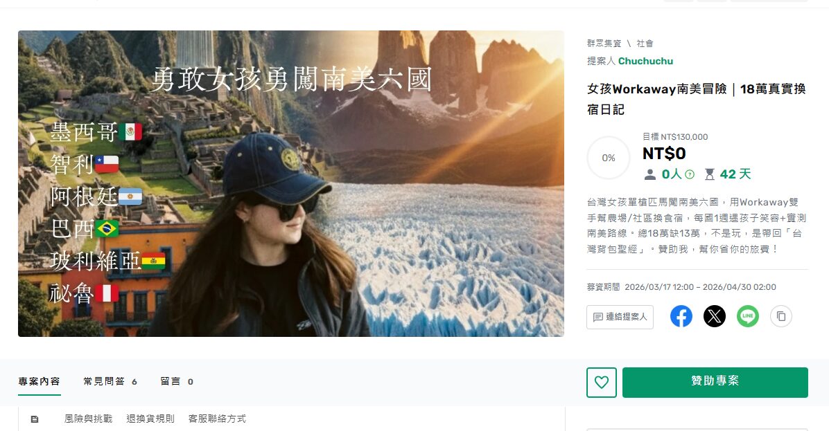 一名台灣女子要去南美六國,總18萬缺13萬,於是開募資稱,稱不是玩是帶回台灣背包聖經,「贊助我,幫你省你的旅費!」引發熱議後募資已撤下,她也說「就算這個募資活動成功了,也確實不該拿來使用」