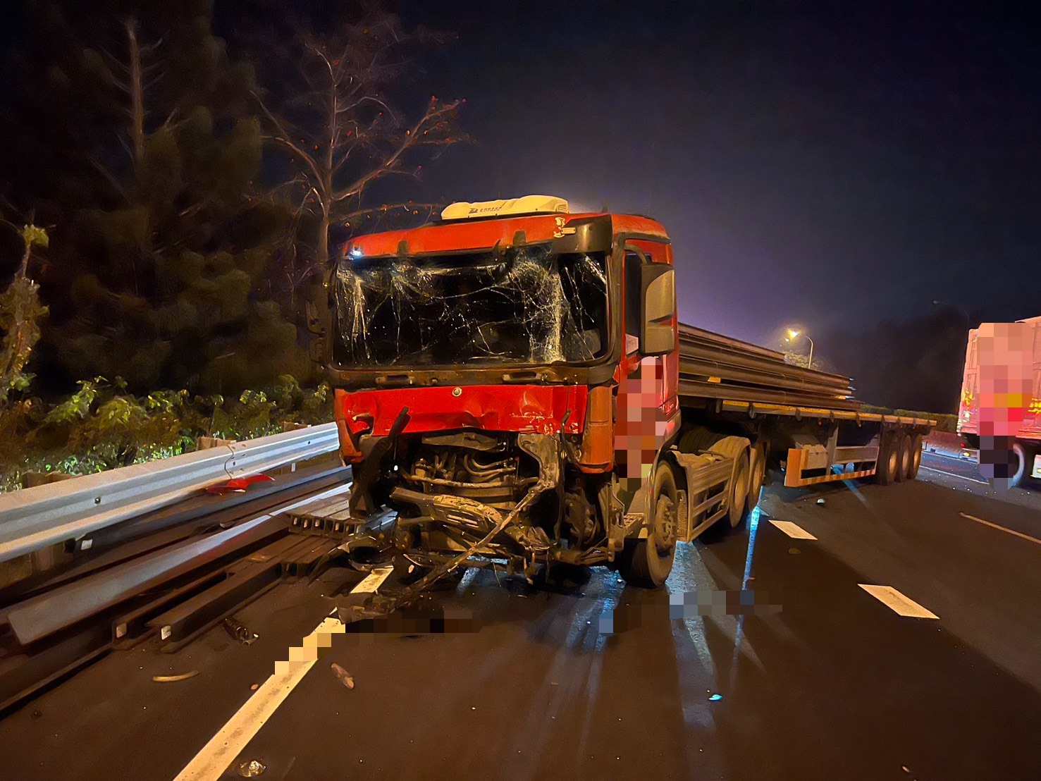 拖板車車頭撞毀載運鋼架掉落。翻攝畫面