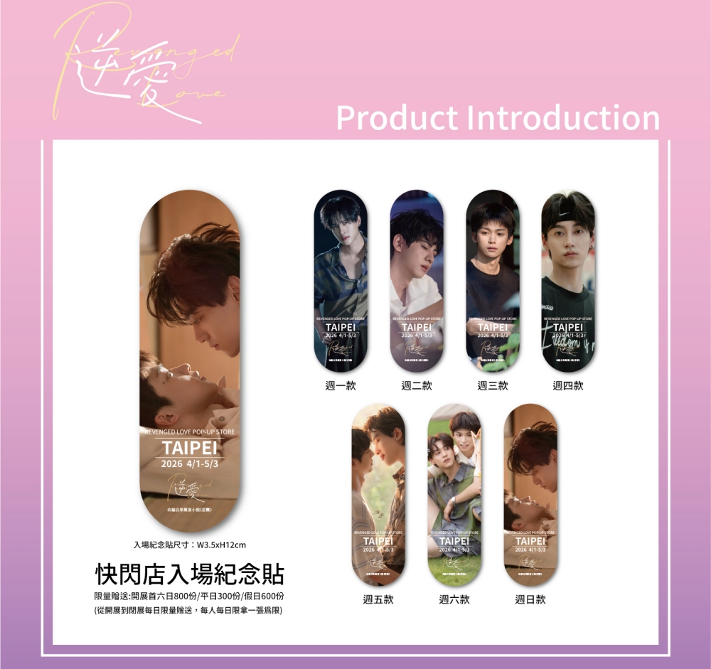 譽為2025上半年最矚目、討論度炸裂的《逆愛》(Revenged Love)自開播來憑藉極高話題度橫掃 Threads、小紅書等各大社群媒體,這次終於跨出螢幕,正式宣佈將熱度由線上延燒至實體快閃!這次不只要觀眾看戲,更要觀眾直接走進這場由霸道總裁與純愛少年交織出的愛慾博弈!官方首場快閃店將於2026年4月1日起,限時進駐新光三越南西店一館9F,展區不但展示劇中大量劇照外,規劃八大互動展區,邀請所有的「逆愛粉」近距離感受這場逆襲的魅力。