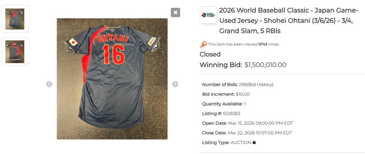 2023年舉行的第5屆賽事中,大谷在對戰澳洲時所穿的球衣曾以12萬6110美元(約新台幣1700萬元)成交。相隔3年,本次價格暴漲超過10倍,再次證明了大谷在全球的超高人氣。