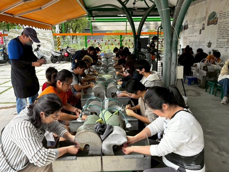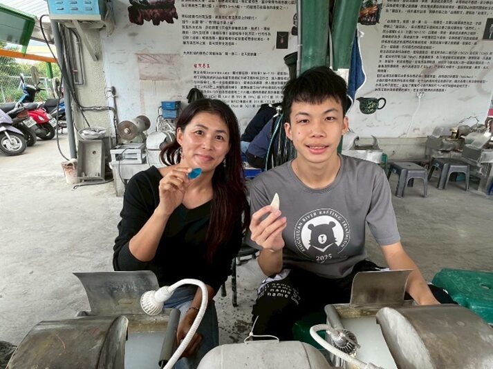 活動一開始,由工藝師鍾翔和帶領導覽,深入介紹玉石的種類與形成背景,並安排實地採集體驗,使學生與家長能從源頭認識材料特性。隨後進行磨玉DIY與加工課程,在專業指導下,親子完成專屬玉飾作品,大家都興致盎然。透過親子共學,每組產出「家傳玉項」的作品,不僅是工藝成果,更承載家庭情感與記憶。活動最後也進行家庭教育資源宣導,強化家長對親職教育的理解與應用。