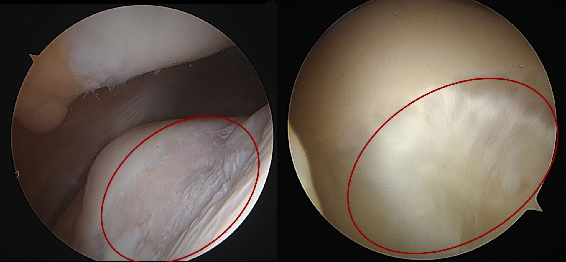關節鏡頭下膝蓋軟骨損傷情形(左),經自體軟骨移植,成功再生(右)。