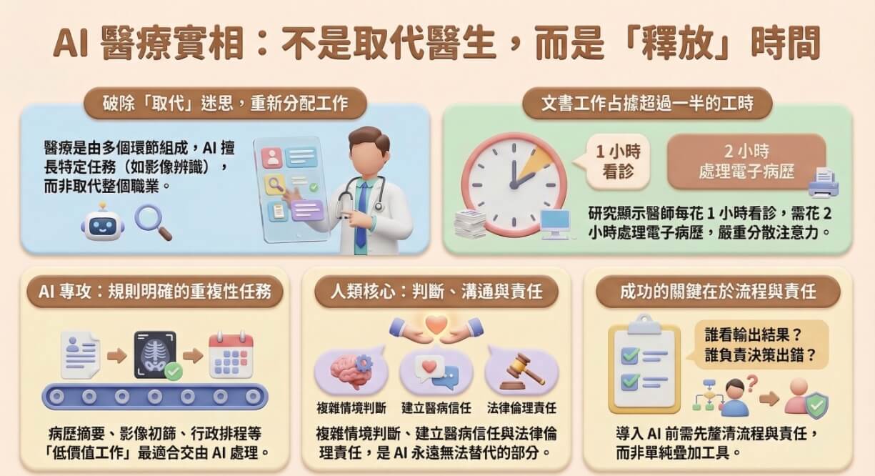 - AI 在醫療的最終目標是騰出人的時間,用於需要判斷、溝通、承擔責任的場合