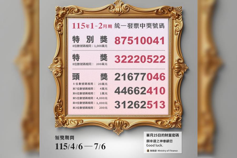 財政部今(25)日公布115年1、2月統一發票中獎號碼,1000萬元「特別獎」的8位號碼為「87510041」;200萬元「特獎」8位號碼為「32220522」。