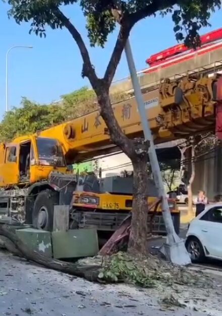 台中大型吊車失控追撞6車,還撞斷路樹及路燈桿。翻攝畫面