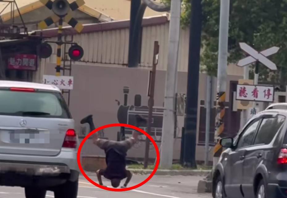 從畫面可見,男子就在道路與鐵道交會處附近做出高難度動作,一旁車輛正常通行,對比之下更顯突兀。雖然無法確認其動機,但如此行為出現在公共道路旁,仍讓不少人直呼「看不懂」、「有點危險」。