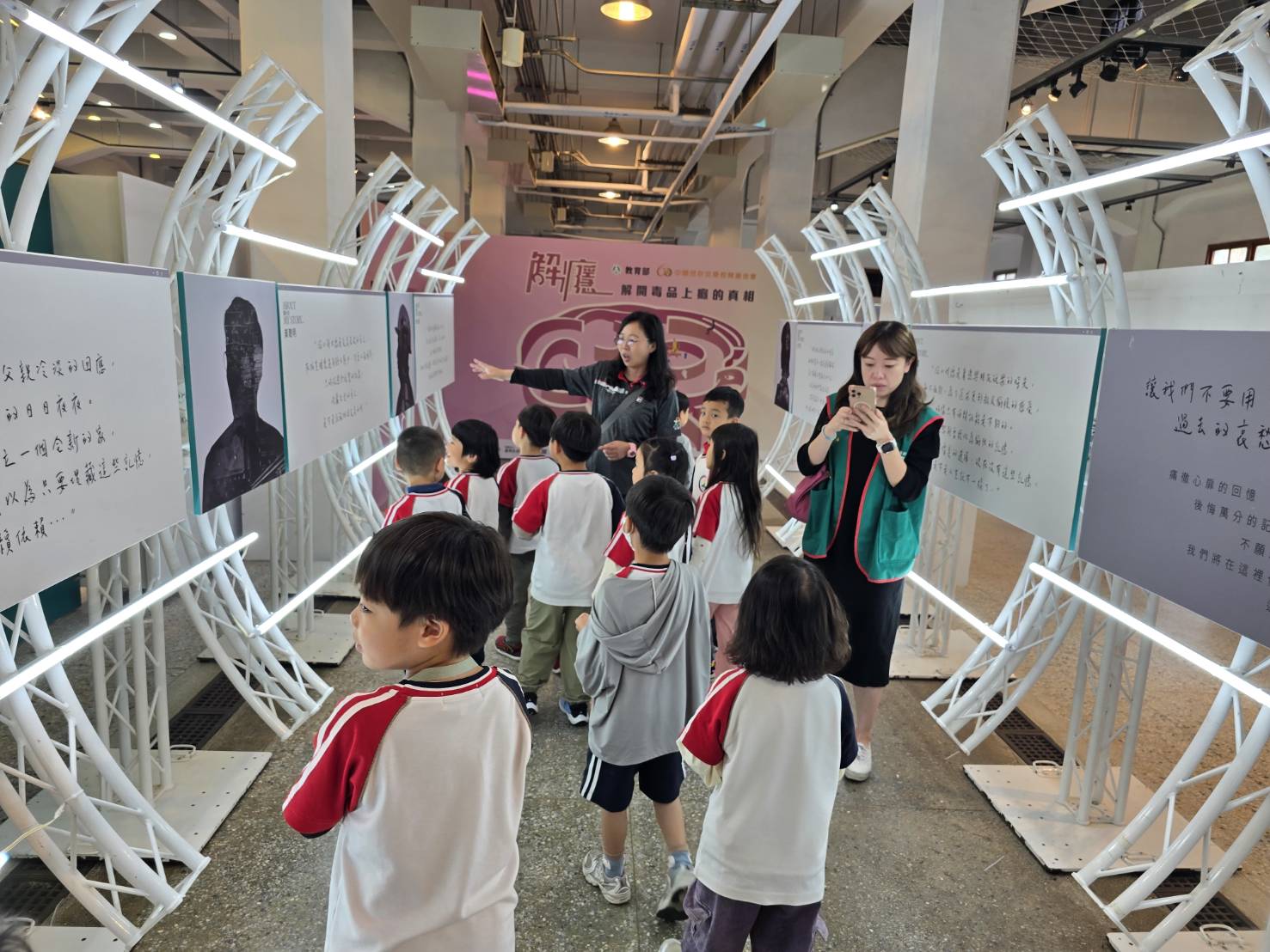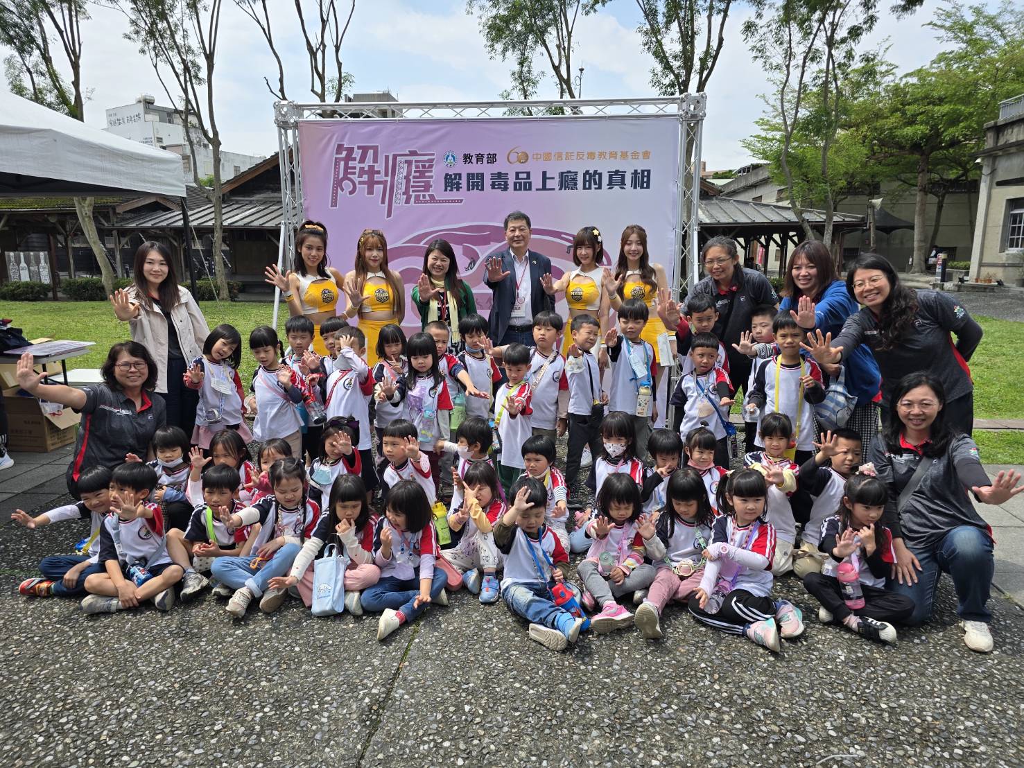會後,許嘉倩、王卓鈞、徐榛蔚、張慧娟等人也與活潑可愛的小朋友合影留念,並參觀會場外陳設的攤位,以及「毒」到之處的展區。教育部將拒毒的力量擴及東部學生與民眾,籲請民眾偕同子女透過創新的展覽內容,達到親子共學的目的,共同關注毒品成癮議題,守護孩子們健康成長。