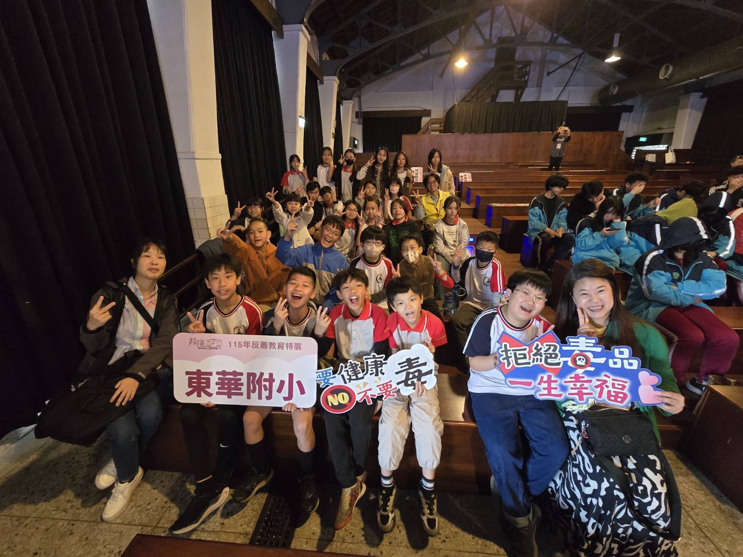 ▲教育部學生事務及特殊教育司代理司長許嘉倩(中排左)、中信反毒教育基金會副董事長王卓鈞(中排中)、花蓮縣長徐榛蔚(中排右)與東華附小學生合影。