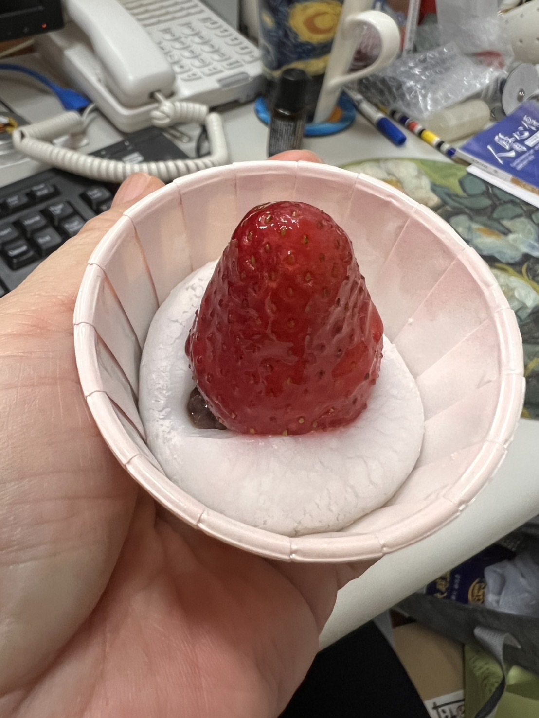 「莓滿大福」選用新鮮飽滿的大顆草莓,搭配細緻綿密的紅豆餡與Q彈麻糬外皮,一口咬下,就在舌尖交織出的酸甜滋味,期盼為忙碌緊湊的醫療作業舒壓療癒。