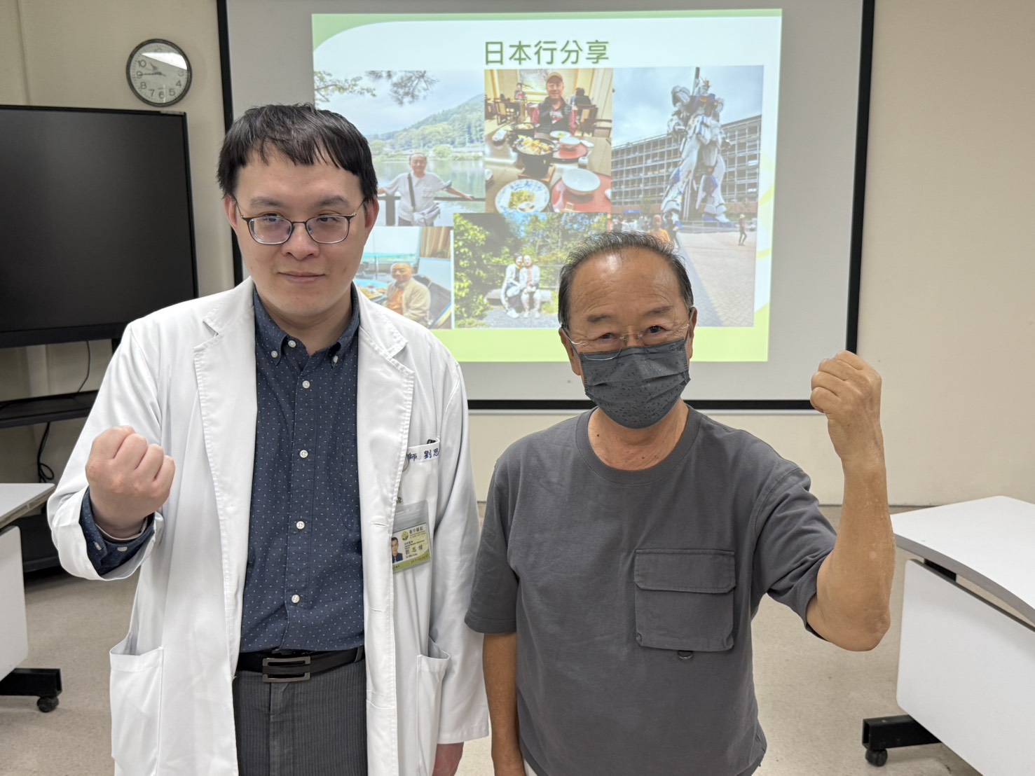 衛生福利部臺中醫院劉思緯醫師(左)與10年腎友王先生(右)一起幫腎友加油,強調只要事前做好準備,腎友也可以從容到國內外旅遊。