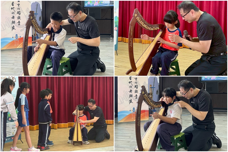 正聲廣播公司台中台「聲動傳愛~琴人抱豎」公益之旅,3月24日邀請豎琴獵人李哲音老師前往彰化縣埤頭鄉豐崙國小與埔鹽鄉新水國小,透過豎琴帶領小朋友們展開歡樂的音樂旅程。