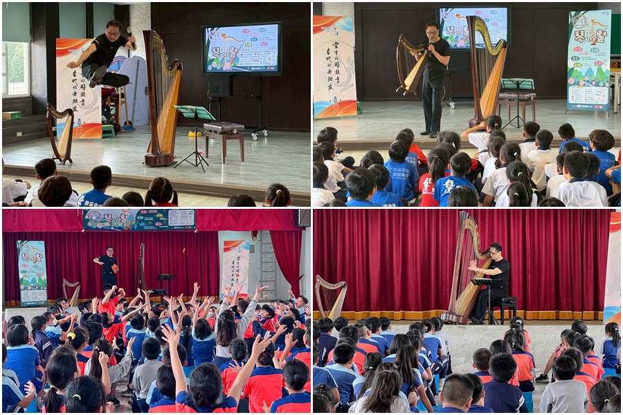 李哲音老師帶著22弦小豎琴及44弦踏板豎琴,以寓教於樂的互動方式,讓學子們認識豎琴的發展歷史、樂器結構及演奏方式,並且分享自己的音樂故事及帶著豎琴到台灣偏鄉小學演出的初衷。李哲音不僅是琴藝精湛的豎琴演奏家,說學逗唱也是樣樣精通,成為孩子們的開心果。