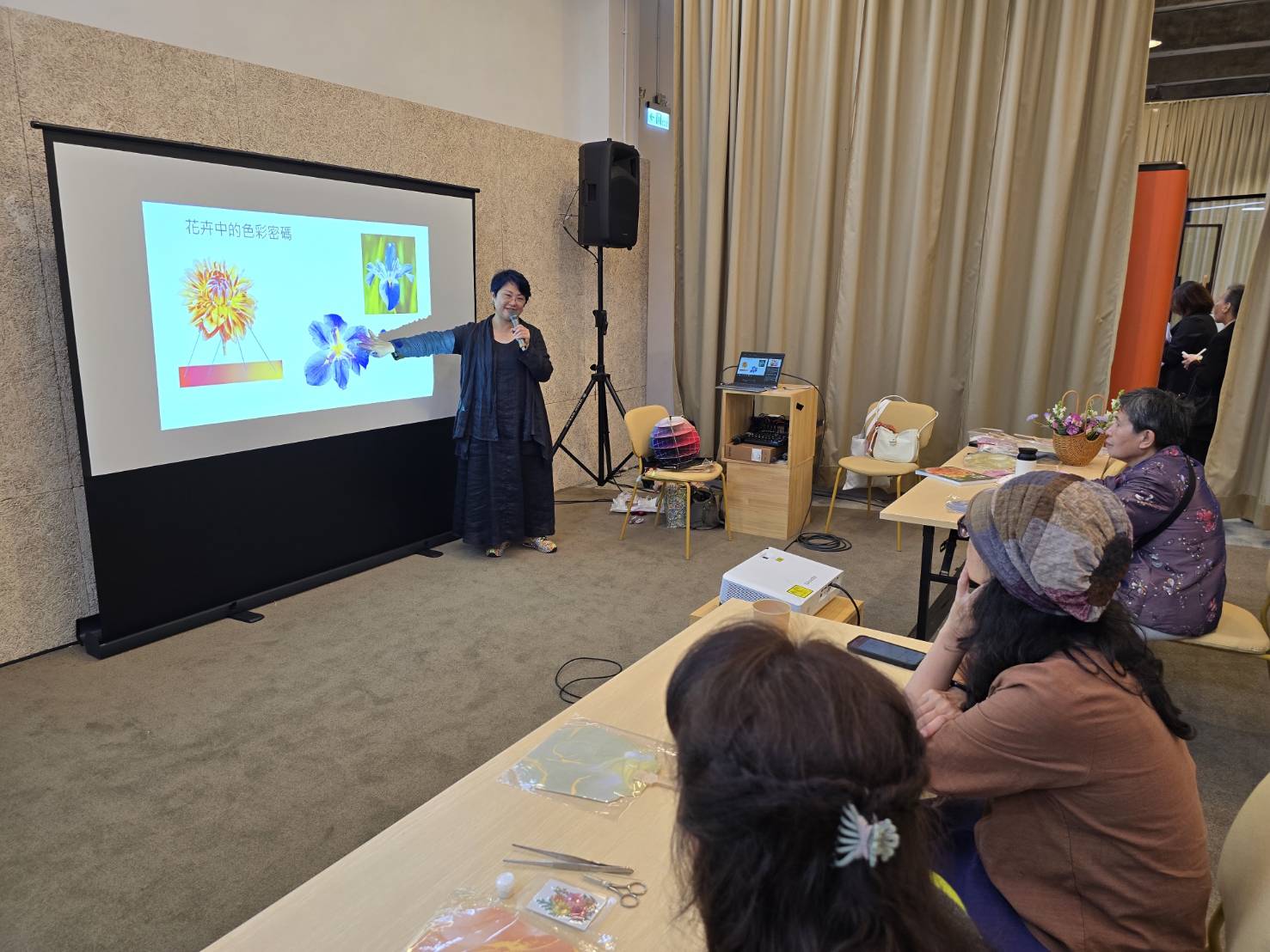 ▲熟齡網紅「花媽」在「樂夢星工廠」傳授花藝製作技巧。