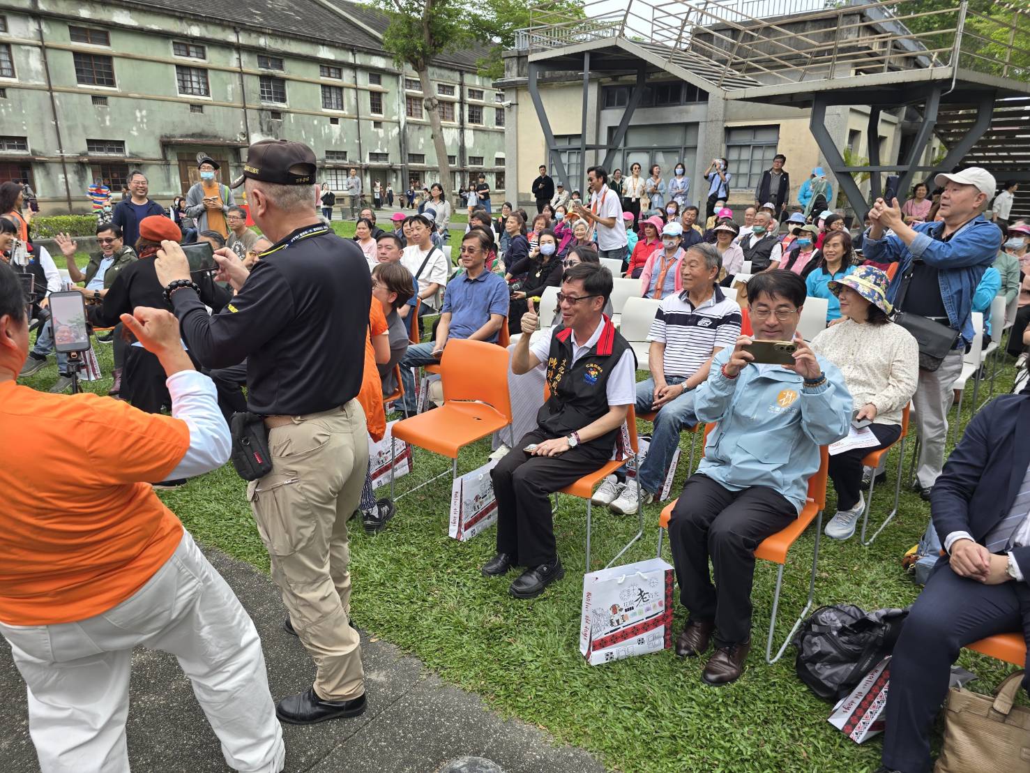 ▲熟齡網紅突然從觀眾席紛紛冒出作業,花蓮縣文化局長陳建村(右二)樂得比讚。