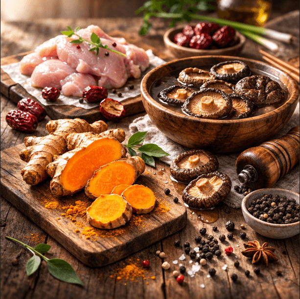 它不是藥,也不是保證不生病的神奇湯品。薑黃、香菇、雞肉等食材屬於「支持型飲食」,能幫助調節發炎反應與提供免疫細胞所需營養。重點在於長期穩定的飲食結構,而不是單一食物的功效。