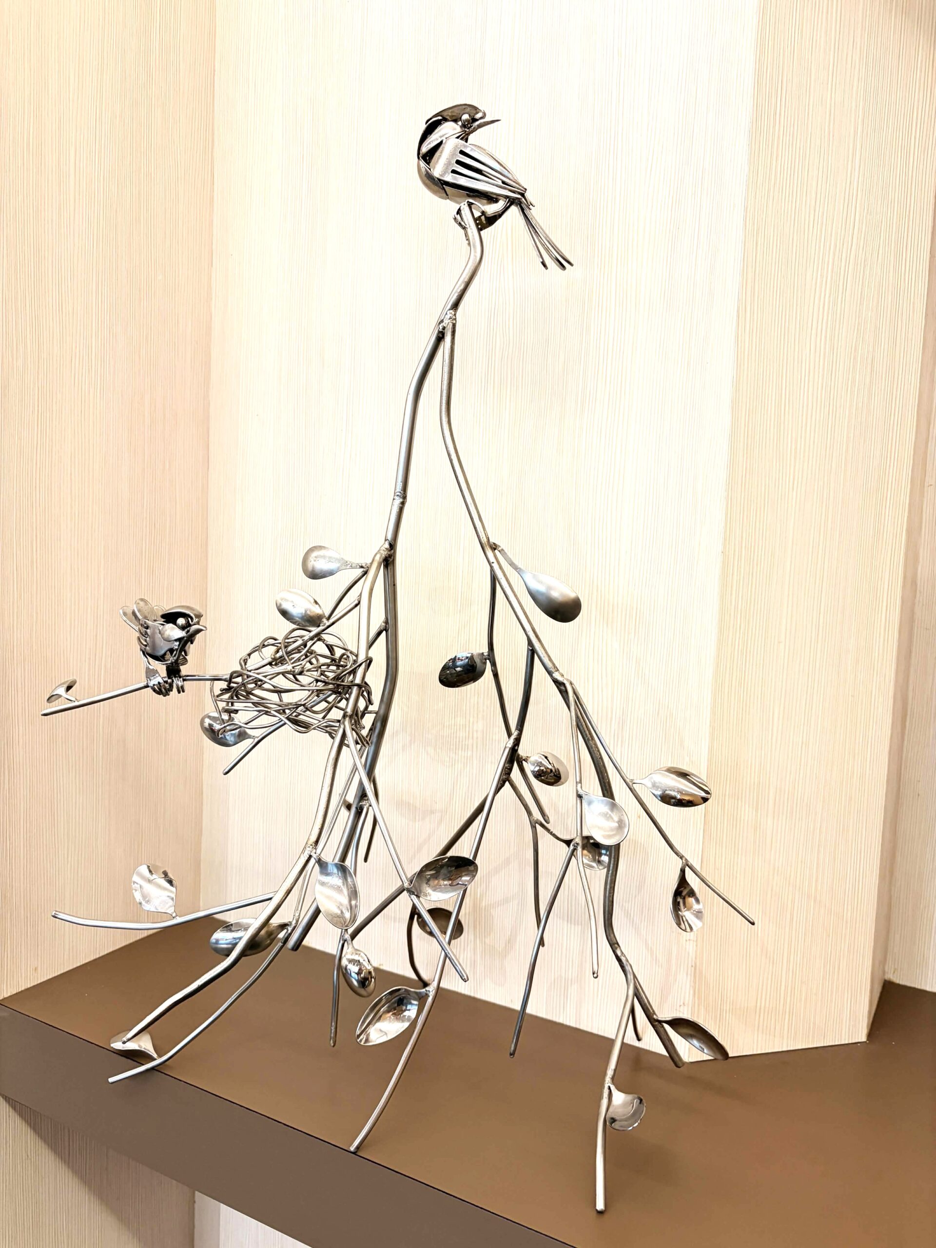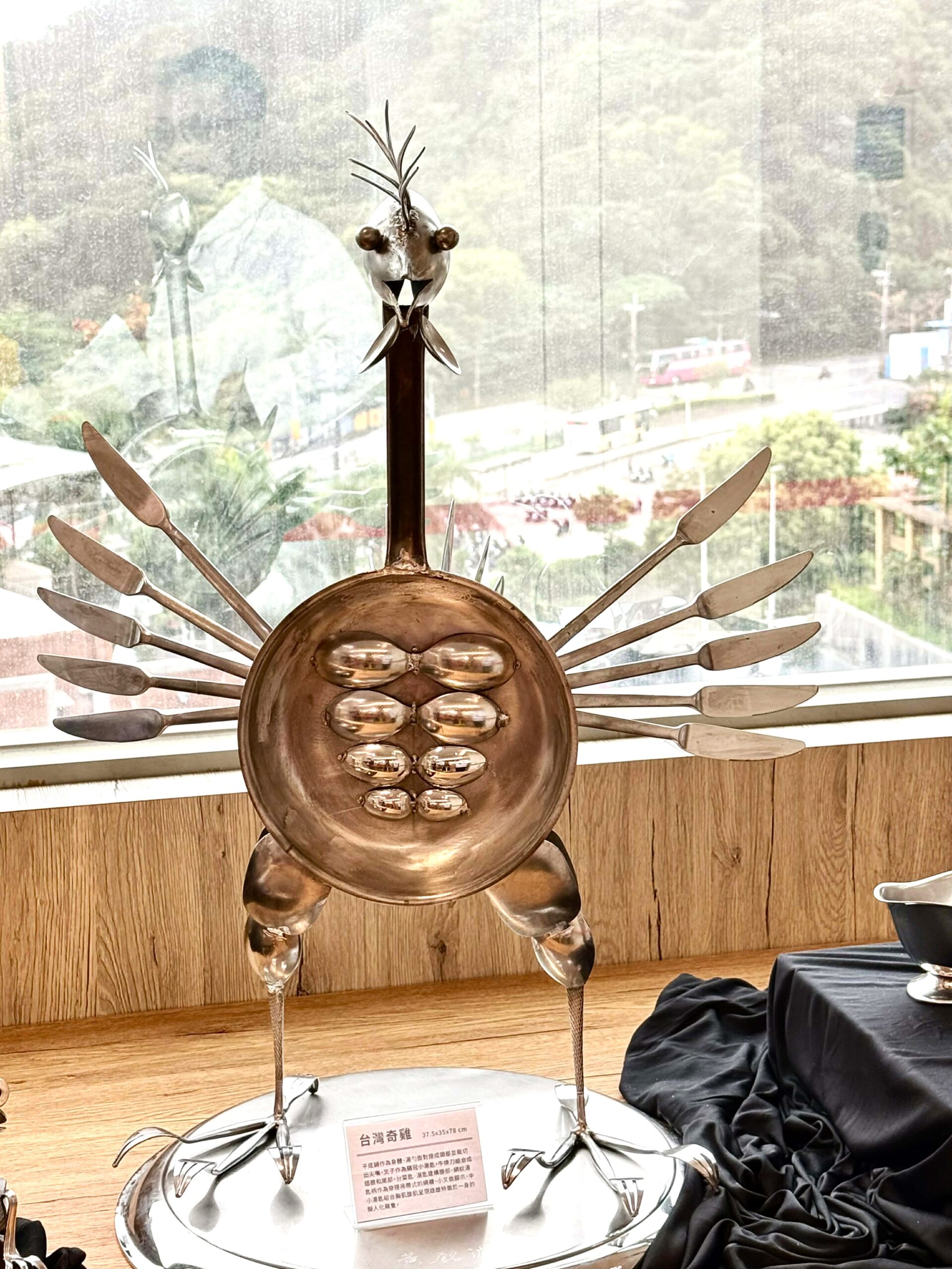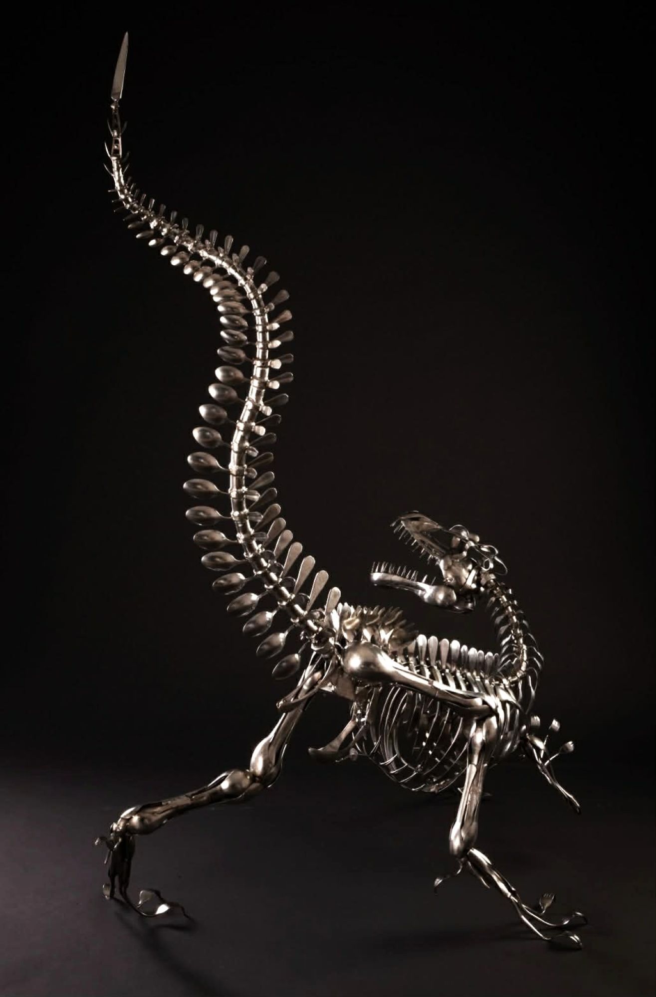 黃銘波的不鏽鋼雕創作迅猛龍高180公分、身長兩米,先有骨架再有恐龍雛形,買小型模型加上拿捏果雕3D基礎,以型取型、形體架式、標本角度,前後創作兩三年時光。選用220根湯匙、水果叉,借重骨幹不銹鋼,特別選用316規格醫療等級、304規格廚具會生鏽、430規格掃把畚箕進行亞焊,研發過程失敗是常態。30公斤重的迅猛龍可以拆解成三座再組裝起來,目前作品已獲多位買家青睞,收藏價值節節高漲。