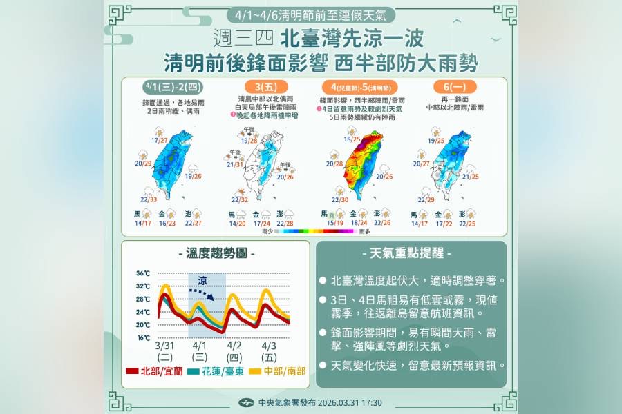 清明節前至連假天氣重點。圖/報天氣 – 中央氣象署臉書
