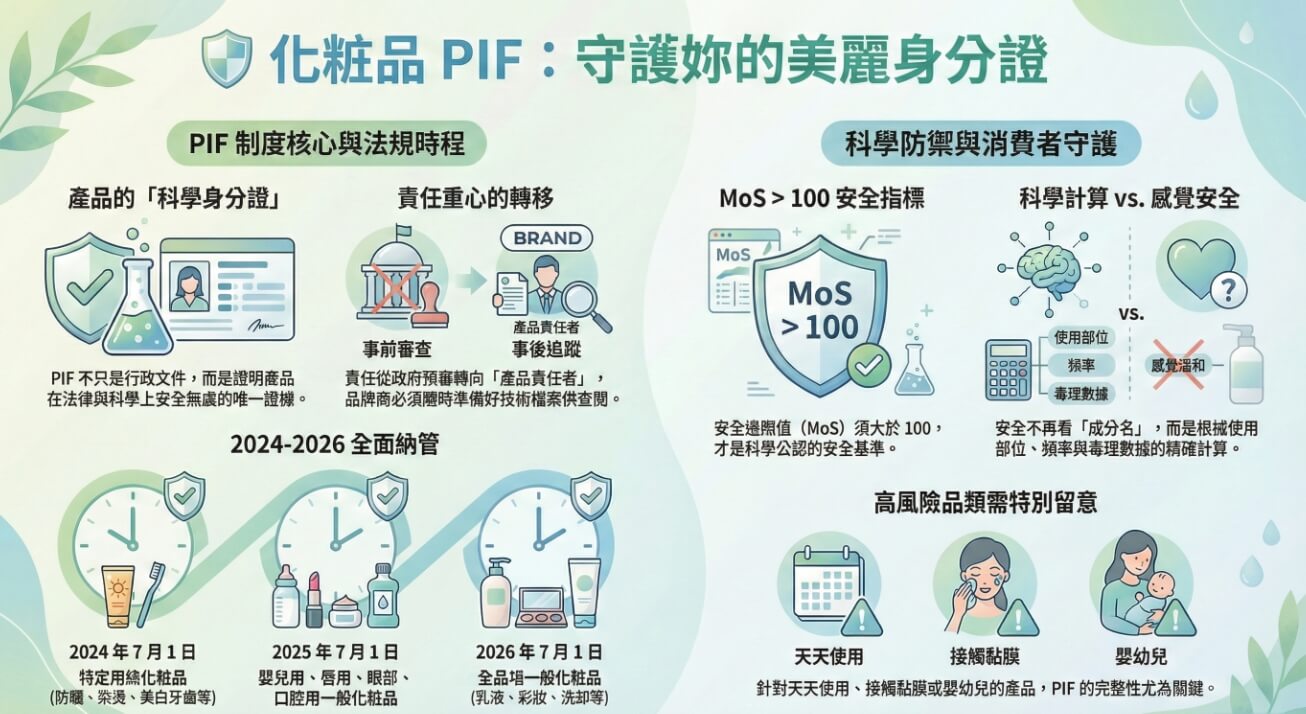 在新的管理邏輯下,化粧品 PIF 不只是行政資料,而是用來證明「這個產品在合理使用情境下,風險被評估過」。安全不再等於「感覺溫和」,而是建立在暴露量、使用頻率與成分毒理的計算上。這樣的制度,對消費者來說是一層保護,但也有盲點——你看不到內容,只能判斷它有沒有被好好建立。別小看這一點,當產品出現問題時,有沒有 PIF,往往決定能不能說清楚責任與風險來源。