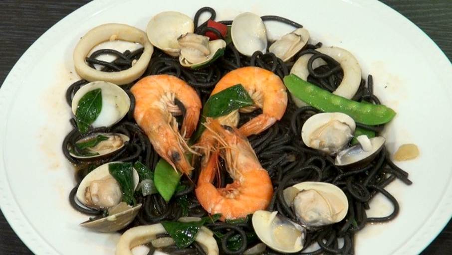 ▲黑色墨魚義大利麵搭配鮮蝦、蛤蜊與魷魚,大火快炒鎖住海鮮鮮甜,呈現桔磨坊義式麵屋招牌濃郁海味料理。