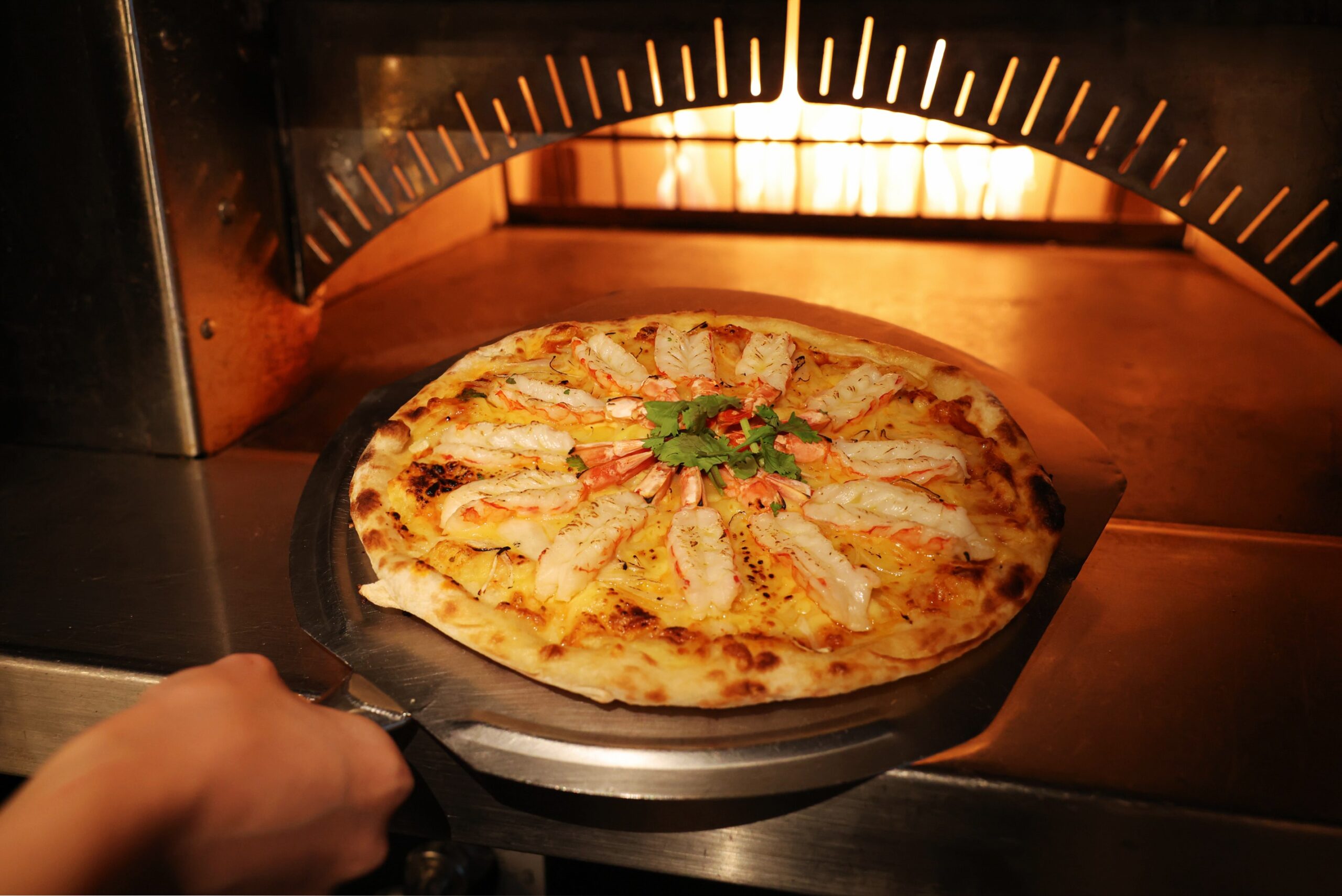 另一道「泰式船麵」也是本次活動的亮點,主廚以醇厚的豬龍骨高湯為基底,搭配米粉與黃麵兩種麵體,接著加入豬肉片、貢丸、新鮮豬血、炸豬皮、豆芽菜及空心菜等經典配料,最後淋上特製辣醬提味,堆疊出濃郁香辣的道地風味,讓饕客彷彿置身在泰國運河邊的小船麵攤,感受熱鬧迷人的街頭食趣。此外,每整點出爐的窯烤披薩則由主廚發揮巧思,將泰式酸辣風味融入其中,打造酸香鮮明的「酸辣蝦披薩」,以酸辣醬鋪底,搭配鮮蝦、香茅與辣椒等辛香料,再撒上濃郁起司進行高溫窯烤,酸、辣、鮮、香層層交織,帶來充滿南洋風情的創意美味。