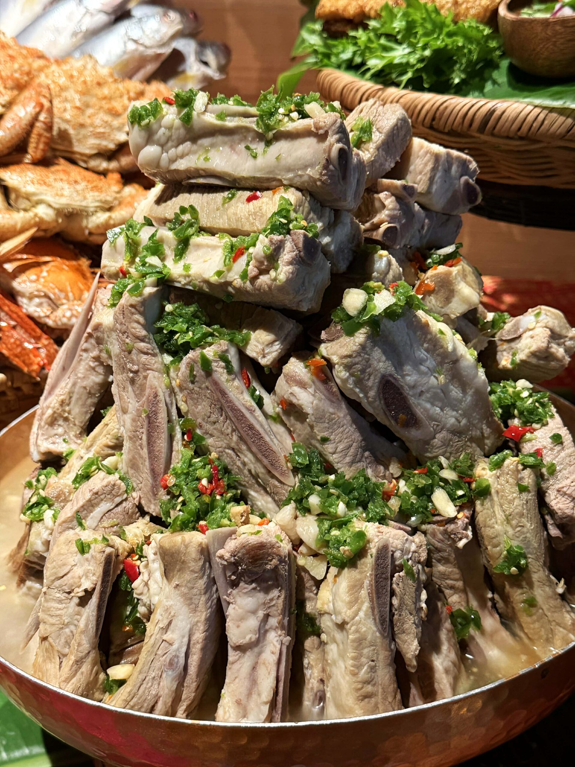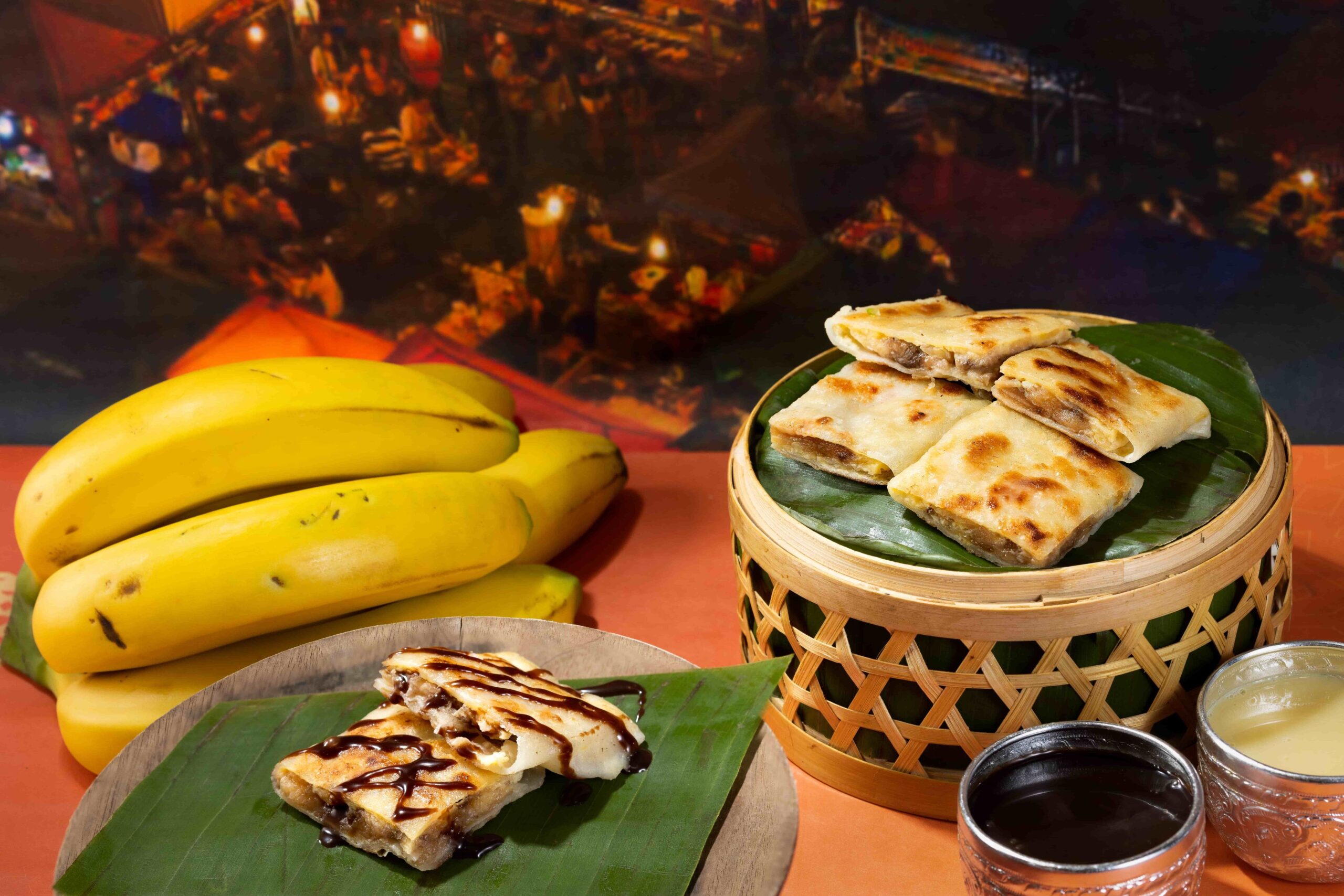 為泰市場二周年歡慶活動規劃菜單的行政主廚孔德望,希望琳瑯滿目的美食在滿足消費者味蕾的同時,也能兼具視覺張力與互動感,讓賓客在取餐之際便能感受到濃厚的異國美食氛圍。熱食部份首先推薦炭香四溢的「現烤海鮮檯」,海鮮種類包括個頭碩大的泰國蝦、肉質彈牙的大魷魚以及油脂細緻的午仔魚,搭配傳統石臼辣醬與花生香蒜汁一同享用,更加襯托海鮮的鮮甜滋味。「泰式脆皮燒肉」則是嚴選帶皮豬五花以香料醃製後慢火烘烤,接著將熱油淋於表皮,使外皮酥脆、肉質多汁,佐以主廚特製的鮮檸羅望果醬與椰糖黑醋汁,酸甜清爽的滋味完美平衡燒肉的豐潤油脂。