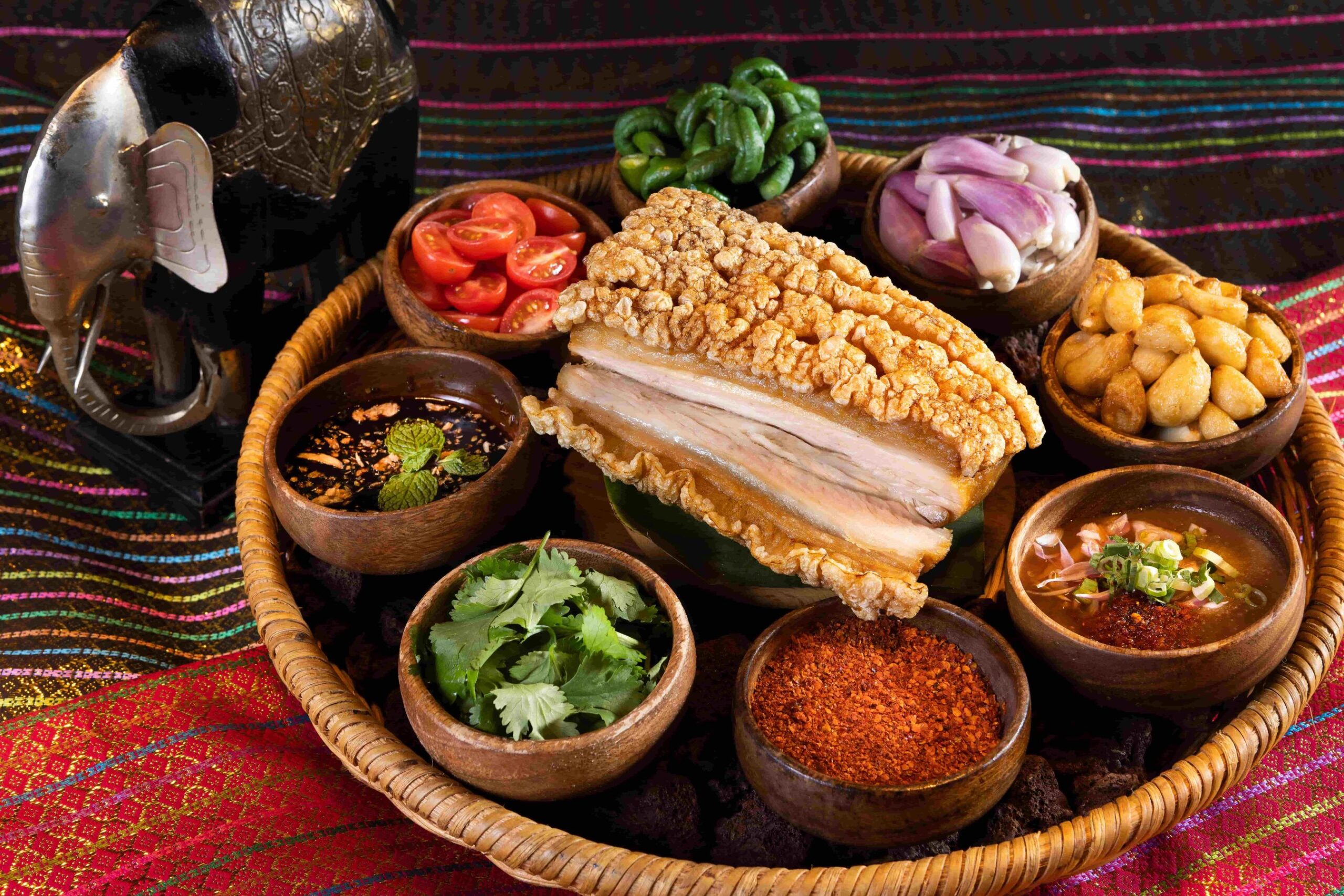 ▲泰國經典料理「泰式脆皮燒肉」,主廚嚴選帶皮豬五花,經香料醃製後慢火烘烤,搭配特製鮮檸羅望果醬與椰糖黑醋汁,滋味清爽不膩口。(圖/台北晶華提供 )