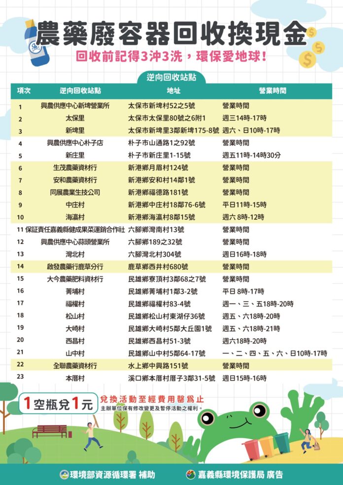 嘉義縣環保局持續推動農藥廢容器回收政策,今年再度辦理「農藥廢瓶罐回收換現金」活動,民眾只要將沖洗乾淨的農藥瓶罐送至指定回收站,即可享有「1瓶兌換1元」的優惠,無論大小皆可兌換,活動經費有限,額滿即止。