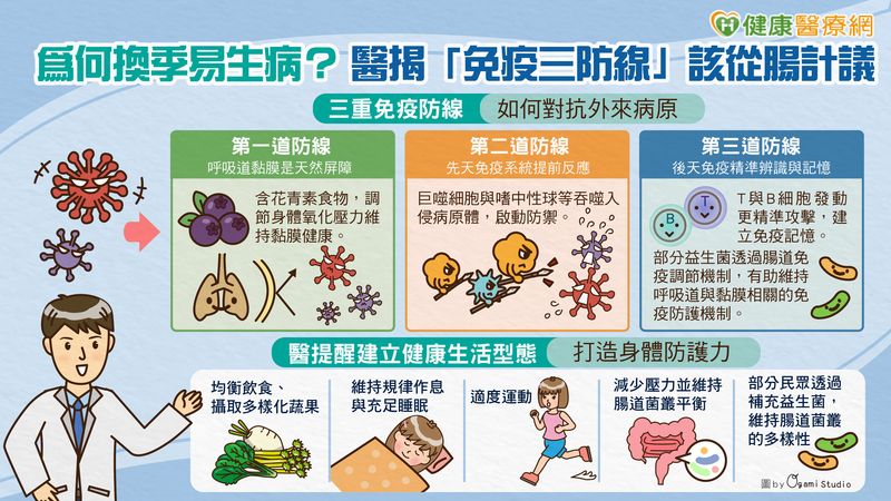 王威迪醫師說明,部分研究觀察到呼吸道感染與腸道菌群變化之間可能存在關聯,因此維持腸道菌叢穩定,被認為與免疫系統運作密切相關。除了均衡飲食、適量攝取蔬果與膳食纖維外,部分民眾也會透過補充益生菌,協助維持腸道菌叢的多樣性。王威迪醫師指出,從健康管理角度來看,建立良好的腸道環境,就像替身體打造一座「免疫訓練堡壘」,讓身體面對環境變化時更有準備。