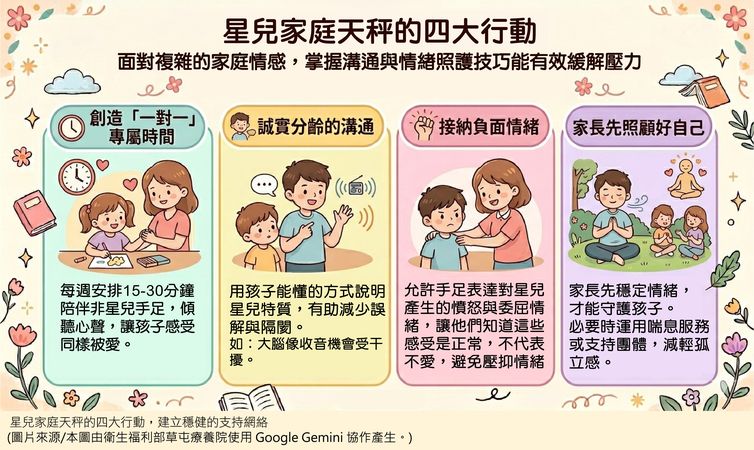 為了善用溝通與關懷,撫平家庭的情緒壓力。許維堅主任整理出四項行動方針,協助家庭在愛與壓力之間找到平衡: