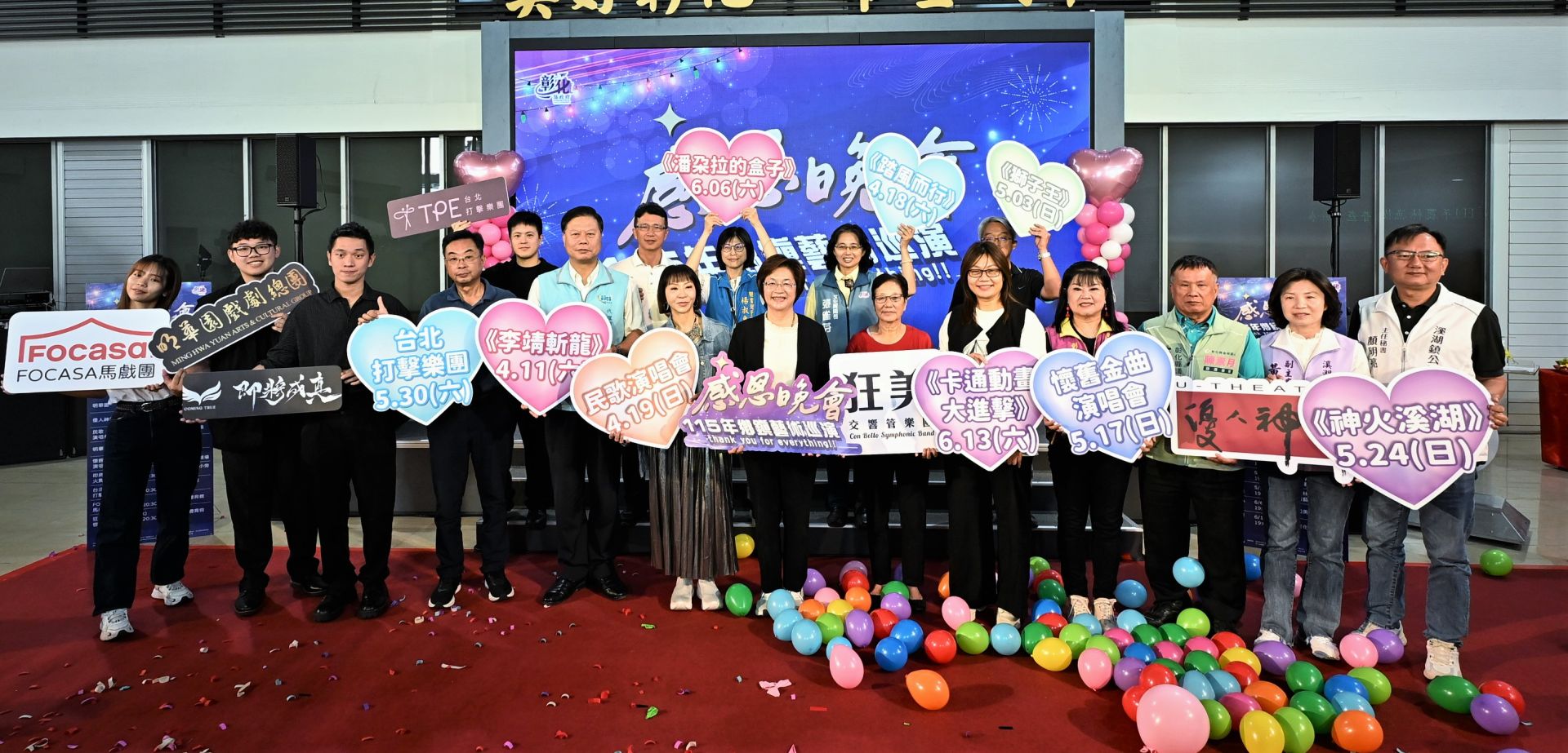 彰化縣政府2日舉辦「115年感恩晚會-鄉鎮藝術巡演活動」記者會,王惠美表示,活動將於4月11日至6月13日間的週末假期展開,規劃9場巡演,邀請多組具國際水準的表演團隊輪番登場,包括明華園戲劇總團、優人神鼓、即將成真火舞團、台北打擊樂團、FOCASA馬戲團及狂美交響管樂團等;同時結合50至80年代的知名歌手演唱經典曲目。活動皆為免票入場。